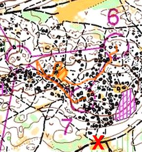 Interposte : Le début de l'interposte se fait bien, mais je me laisse "aspirer" par des concurrents qui sont trop à l'Ouest, et je ne m'en rends pas compte. Du coup je tombe dans la mauvaise zone de rochers pour chercher la balise. Rapidement je tourne en rond avec d'autres. On arrive dans la zone sablonneuse et là une mauvaise lecture de la carte fait que je vais me décaler d'avantage. Je confonds la zone jaune où je suis en train de jardiner avec celle située plus au Sud (le X rouge sur la carte), ce qui après coup est idiot, mais bon, dans le feu de l'action... Pensant être au X, je remonte en Nord-Ouest pour aller vers le poste 7 et je me retrouve en visu de la balise 5 de tout à l'heure. C'est là que je comprends mon erreur. A partir de là, je me recale et je remonte sur la balise, mais que de temps perdu.