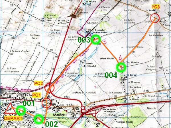 Sortie de PC10 le long de l'autoroute pour rejoindre l'ancienne batterie de Noisy. Là je sais à peu près où se trouve la batterie et j'emmène Pierre. Pendant ce temps beaucoup d'équipes contourne la zone et vont trop loin. L'avantage de connaître le terrain. On poinçonne et on file sur la suivante.