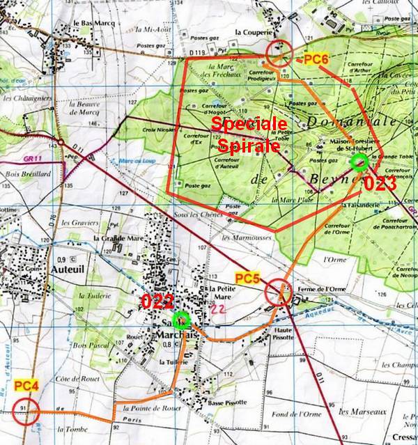 Après PC05, on va attaquer une autre spéciale, celle de la Spirale de Bernouilli. Cette zone de forêt est truffée de plusieurs zones dégagées. L'objectif est, à partir d'une simple photo aérienne, de savoir dans quelle clairière se trouve la balise suivante, sachant que les définitions sont données à chaque balises. (à la balise 23 on nous donne la définition de la 24, et ainsi de suite).
