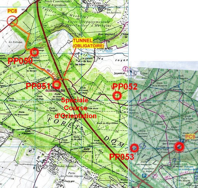 Arrivés à PC08, on rentre en forêt. Là je vais faire une grosse erreur de stratégie... Je balaye rapidement le Road book, on a PP050 et PP051 a prendre puis il y a un bandeau jaune dans le road book que j'interprète comme étant le début de la spéciale de CO. Donc une fois passé PC08, on file chercher PP050 et PP051. Pendant qu'on poinçonne PP051, j'en profite pour sortir les 2 cartes de la spéciale de CO... et ... Oups !!! En fait la CO commençait à PC8... Les balises sont juste présentées dans un ordre différent, mais sur le road book c'est bien indiqué... Et j'ai mal lu...