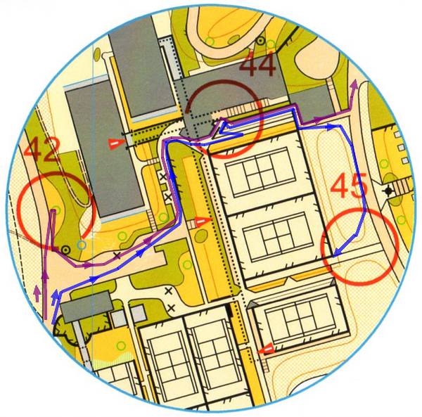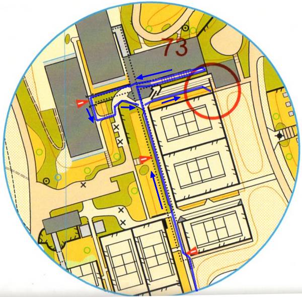Je sors plein ouest pour aller chercher l'allée qui passe vers la balise. Je remonte l'allée et en vue des terrains de tennis je pique vers le poste où il y a maintenant pas mal de monde en train de poinçonner (ça aide aussi un peu)