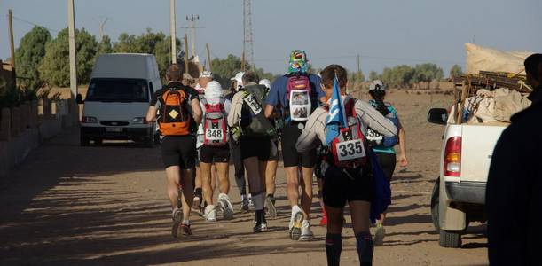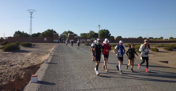 J'essaye de rester sur les traces de 4x4, contrôlant régulièrement avec la frontale. La piste fait des "S" mais là je ne joue pas au petit malin en coupant tout droit. Je contourne encore et encore. A un moment j'arrive dans une sorte de cuvette où les 4x4 on fait des tours sur eux même. Zut, un cul de sac. Il me faut revenir un peu en arrière pour trouver, presque par hasard, le contournement qu'ils ont pris. Un peu de chance ça ne fait pas de mal. La suite de la progression ne change pas beaucoup. Dunes, contrôle à la frontale, identification des traces, et ainsi de suite. Finalement je retrouve les premières zones rocailleuses qui annoncent le dernier tronçon sans m'être perdu dans le sable... Quel soulagement. Je retrouve une large piste en dur qui m'amène pile sur le chemin emprunté à l'aller et me fait rejoindre le village. C'est étrange car la rue principale est très éclairée mais il n'y a pas grand monde dehors. Je profite des encouragements de quelques passants que je croise, mais je n'ai plus qu'une envie, c'est d'arriver à l'hôtel. J'emprunte la rue centrale du village, arrive sur la grande place et prend la bifurcation qui va vers la zone où est notre hôtel. Je passe l'oued asséché, et me dirige pile sur l'hôtel qui est éclairé pour la nuit. Les derniers mètres sont faits en courant... juste pour le principe, et même si je suis tout seul à ce moment là. Arrivée Jeudi à 22h45 2h15 de course sur la section 86h35 depuis le départ 5ème position. |