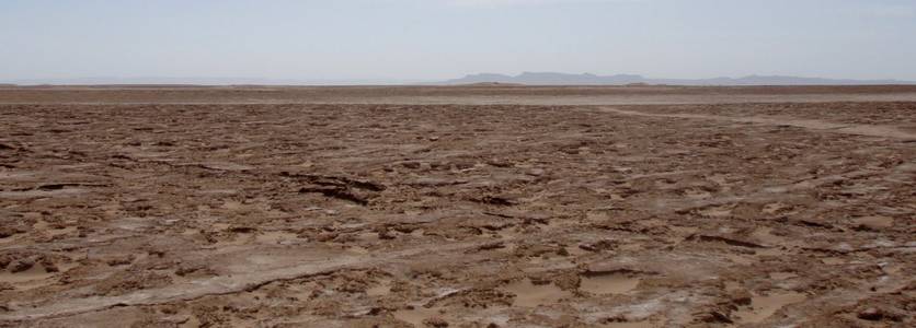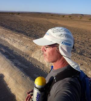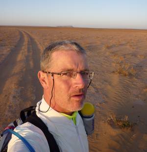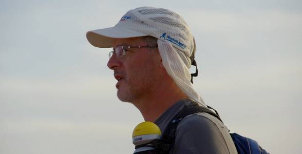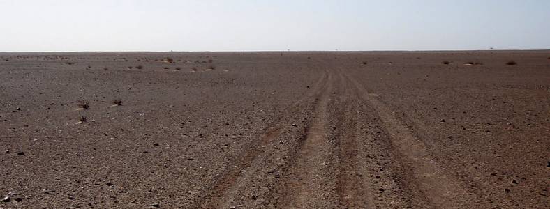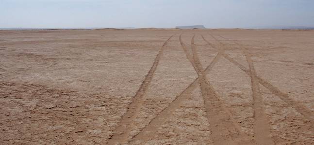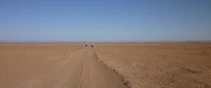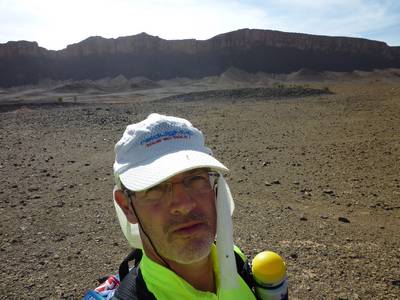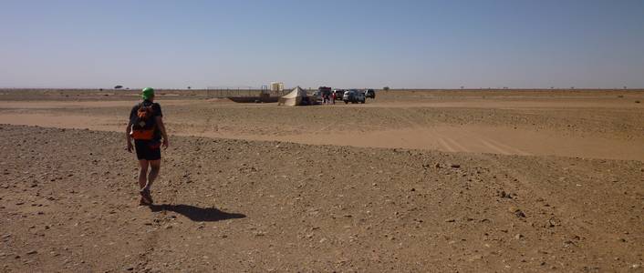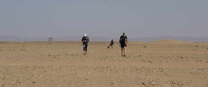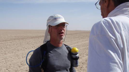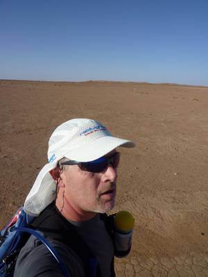 Mon allure de marche s'avère efficace surtout dans la régularité. Et dire que j'ai les jambes pour courir... c'est limite frustrant... Arrivée à CP10 mercredi à 10h59 - 3h59 de course sur la section, et 50h49 depuis le départ - Temps estimé initialement 6h00 - 5ème position. Je fais une bonne pause sur le PC avant d'attaquer la section chaude de la journée. Je prend encore une fois le temps de bien m'hydrater, de manger (y compris ce que les concurrents précédents me laissent parfois après leur passage...) et de me reposer , intégrant toujours une petite sieste sans sommeil de 15-20mn. Je commence à me préparer pour repartir, mais je me rend compte que je n'ai pas revu Gérard et Juju. Je sors de la tente et je devine les deux silhouettes au loin. C'est bon ils arrivent. Le petit jeune tient le coup, ce qui n'était pas gagné d'avance. Je quitte le PC en leur faisant un signe de loin auquel ils répondent. De CP10 à CP11 Départ de CP10 à 11h52 après une pause de 53mn (51h42 depuis le départ). La section qui s'annonce est presque aussi plate que la précédente. Un grand plateau désertique (le lac) sans un poil d'ombre. Ici ce n'est pas la peine de chercher le moindre tamaris, il n'y a rien de rien, même pas un buisson. Un seul PI sur le chemin. Comme il fait un détour, j'envisage de couper droit par le lac, mais dès que je sors de la piste, je tombe sur un terrain avec une croute craquante et un sol meuble en dessous. Après quelques centaines de mètres je me rend compte que ce sera difficile de faire 20km là dedans, sans compter que sur cette distance je ne sais pas ce que je peux trouver ensuite. Je décide donc de revenir sur la piste. Au loin, derrière, un 4x4 arrive au CP. Je reprend ma route quand au bout de quelques km, le 4x4 me rejoint. Dedans il y a Michel, Alain et Jean Claude dont j'avais appris les abandons. Ca fait du bien de croiser un peu de têtes nouvelles.