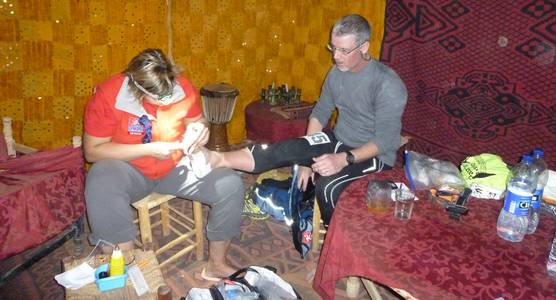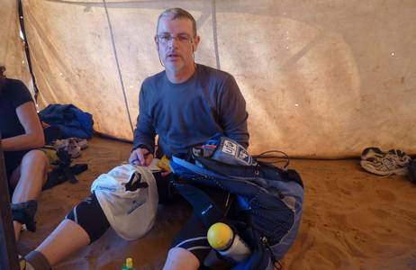 Claude me demande si tout vas bien et si j'ai besoin de quelque chose, et moi bêtement je lui répond "oui, j'ai besoin d'un slip propre"... En fait, je porte le même sous vêtement (en coton) depuis le départ et entre la transpiration et les multiples couches de crème, non seulement ça commence à sentir un peu fort, mais surtout ça provoque des échauffements mal placés, et là encore, mes rechanges sont... dans mon sac à dos. Sur ce je m'installe pour récupérer et me ravitailler quand je vois Claude revenir avec un sous vêtement de course emprunté à Patrick (dont elle avait les bagages dans le 4x4)... Cerise sur le gâteau, elle me donne aussi un mélange de pommade et de vitamine A à passer sur les zones irritées une fois que je me serai changé. Du côté des pieds tout va bien. Les pansements tiennent le coup, et comme il n'y a pas de nouveaux échauffements, on ne touche à rien. Je vais juste en profiter pour changer de chaussettes et mettre la paire prêtée par Koko avant le départ. Claude, Alex et William repartent car ils doivent aller sur CP13, et moi je profite tranquillement de ma pause avec le responsable du CP