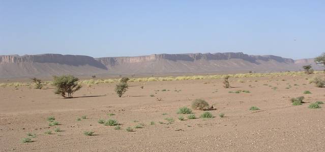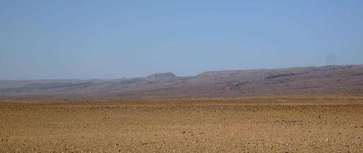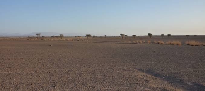 Ma réflexion va être la bonne. une fois au pied, une piste longe la barre rocheuse. Je progresse sans trop de difficulté sur plusieurs kilomètres quand je commence à trouver quelques ravines provoquées par les failles dans la barre rocheuse. La piste, elle, s'enfonce dans une de ces failles, mais je sais que le CP est situé bien au delà de la montagne et qu'il me faut la contourner totalement (encore un des gros avantages de connaitre le terrain). En effet, quand on est au pied de la montagne, l'azimut montré par le GPS laisse à penser qu'il faut entrer dans une de ces failles, alors que le point GPS est de l'autre côté. C'est d'ailleurs l'erreur que vont commettre Dom et Patrice, se retrouvant coincés face au PC mais isolés par une falaise de plusieurs centaines de mètres (le tracé en bleu sur la carte). J'entame donc un passage dans les premières ravines, et c'est là que je vais manquer de lucidité. Si c'était à refaire, dès les premières ravines, je serai redescendu vers la plaine pour attaquer la partie plane. Mais au lieu de ça je vais m'entêter, me disant à chaque fois que je vais retrouver une piste carrossable. Au bout d'une trentaine de ravines, je me rend compte que si je continue comme ça, je risque de perdre tout le bénéfice de mon bon choix de début de parcours. Je décide donc, un peu tardivement, d'entamer une descente vers la plaine. Je croise un berger avec son troupeau de chèvres (au moins une cinquantaine), traverse quelques queues de ravines, puis je retrouve la plaine finale. Ici, il suffit juste de prendre un azimut un peu grossier (cap pris sur une montagne dans l'axe du CP) d'éteindre le GPS et d'avancer. Bien sur, pas question de refaire l'erreur du CP2, aussi j'effectue un contrôle d'azimut toutes les 30mn, mais là je progresse dans la bonne direction, d'autant qu'il n'y a aucune piste pour m'induire en erreur.