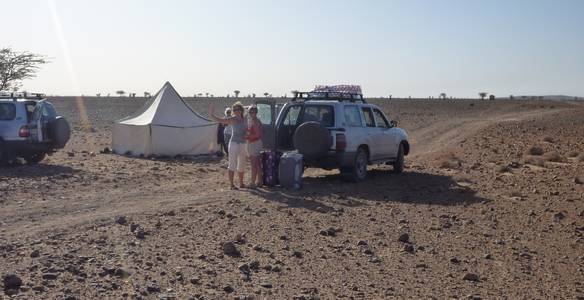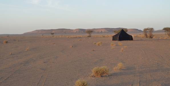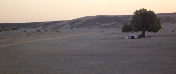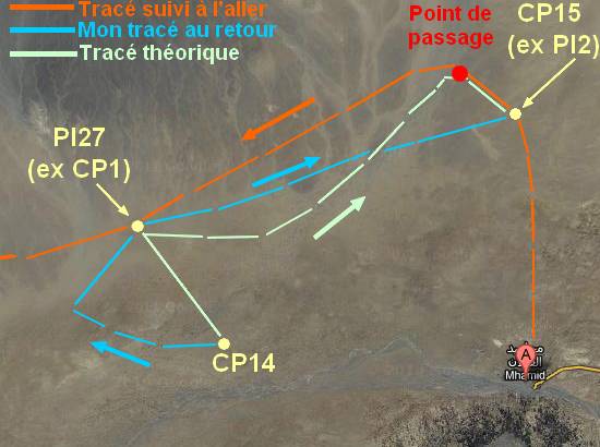 Ayant annoncé ça au responsable du CP, il me propose de venir m'installer derrière le gros tamaris situé devant la tente. Il y a installé des tapis et des matelas et il y fait meilleur que dans la tente. Il me propose un thé que je m'empresse d'accepter puis, pour tuer le temps je décide de faire une petite sieste. Après tout autant prendre des forces pour la fin. Un peu avant 15 heures je me prépare à partir. Il fait toujours bien chaud mais ça devrait bientôt baisser d'intensité. Je fait le point avec le responsable du CP sur le meilleur itinéraire à suivre. En fait pour aller de CP14 à CP15, le plus court c'est de faire une trace directe, sauf qu'on est obligé de passer par le point intermédiaire PI27 qui est complètement excentré. En fait le PI27 correspond au CP1 de l'aller, et le CP15 correspond au PI2 qui était aussi un PI obligatoire à l'aller. Le problème c'est que les 6km en CP14 et PI27 correspondent à une zone de dunes dans lesquelles des concurrents avaient pas mal souffert il y a 2 ans. Il existe bien une autre solution qui serait de contourner cette zone de dunes mais qui oblige à revenir un peu en arrière, ce qui sur le principe ne m'enchante pas trop. Par contre, galérer dans les dunes aussi près de la fin, me branche encore moins. Du coup j'opte pour la solution de contournement. Le responsable du poste me dit qu'il me suffit de revenir en arrière jusqu'à la fin des dunes puis de prendre à 90° jusqu'à la piste (celle qui faisait la jonction entre CP1 et CP2) puis de suivre cette piste jusqu'au PI27 (ex CP1). Pour ne pas me tromper il me donne un indice qui va bien me servir... "Tant que tu vois des Tamaris, c'est que derrière il y a des dunes. A la fin des Tamaris, tu pourras couper. Mon idée du tracé est à peu près celle là (ah oui, vu comme ça, ça calme... !)