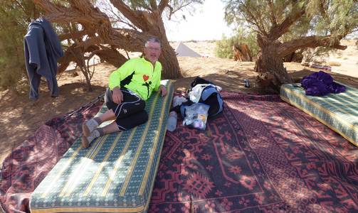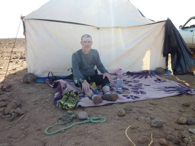 Arrivée à CP11 mercredi à 17h00 - 5h08 de course sur la section, et 56h50 depuis le départ - Temps estimé initialement 6h00 - 5ème position. Je me pose rapidement sur le grand tapis déployé à l'ombre devant la tente, bois mon coca et un thé préparé par le responsable marocain du CP.