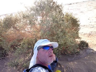 Là, le mode "Off" est de rigueur. Il y a bien 2 PI mais comme c'est tout droit de chez tout droit je les zappe et passe directement en cible sur CP14 Je sais qu'une fois là bas ce sera pratiquement gagné, mais d'ici là, je vais avoir le temps de cogiter un peu. Heureusement que j'ai de la distraction avec le passage de 4x4. Pas passionnant, mais ça coupe la monotonie du plateau, même si après leur passage il faut gérer le nuage de poussière. Tous me saluent au passage et certains viennent même discuter un peu, étonnés de me trouver en ce lieu perdu. Il y en a même un qui me propose de m'avancer sur la piste... c'est sympa mais je décline poliment son offre. Je n'ai pas fait tout ça pour monter dans un 4x4 quand même !!! Je croise un gros pick up qui se dirige vers moi. C'est Alain avec Dom et Patrice qui se rendent sur CP13. je leur indique ce que je sais sur Juju, mais visiblement ils sont déjà au courant (!). Patrice m'indique que cette section est interminable (merci, je commençait juste à m'en rendre compte) et que je vais avoir le temps de cogiter... Sur ce, ils reprennent leur route et moi la mienne. Je continue de progresser entre piste caillouteuse et passages de 4x4. Je vois aussi quelques véhicules en prépa pour le Dakar. En fait on les entends souvent avant de les voir. Le 4x4 d'Alain repasse dans l'autre sens. J'en profite pour passer une petite commande à Dom' (des sandales ouvertes pour l'arrivée, les miennes étant dans... mon sac. Comment l'avez vous deviné ?), puis ils filent à nouveau. La chaleur commence à bien me taper dessus, et je n'ai rien pour m'abriter par ici. Arrivé à quelques kilomètres de CP je découvre des zones vert fluo au sol. C'est marant mais il y a de la roquette qui pousse ici d'un vert assez soutenu et surprenant dans cet univers aride. Un peu plus loin le relief commence à changer. la zone plate de cailloux laisse place à un univers sablonneux avec des monticules de terre et des dunes. Par chance de larges pistes passent au travers de tout ça et favorisent ma progression. Je profite du premier gros tamaris pour faire une petite pause à l'ombre et m'hydrater. Je repars au milieu des pistes de 4x4 croisant des Quad de reconnaissance en charge d'ouvrir la voie aux 4x4 du dakar pour leurs entrainements, mais à la différences de ceux de tout à l'heure, ceux là n'esquissent même pas un petit geste de salut... pfffff ! Finalement, en affinant progressivement mon azimut je trouve enfin le CP14 Arrivée à CP14 Jeudi à 13h05 - 5h31 de course sur la section, et 76h55 depuis le départ - Temps estimé initialement 6h30 - 5ème position. Encore une fois la chaleur m'a quand même pas mal plombé. Je pose mes affaires près de la tente, bois mon coca, de l'eau, et réhydrate un plat parce que je commence à avoir faim. Une fois tout ça fait ainsi que le plein en eau pour tout à l'heure (je préfère faire ça tout de suite pour ne pas oublier et prendre le risque de repartir à vide), je décide de différer un peu mon départ pour éviter la forte chaleur de l'après midi. je décide de ne repartir que vers 15h00, comme ça je n'aurai qu'une heure de chaud et ensuite je pourrai bénéficier de la baisse des températures.