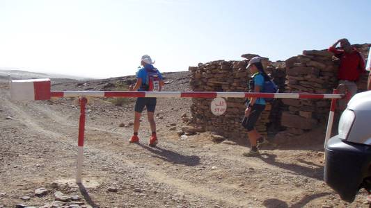 Pendant cette traversée je prend un petit coup de bambou. Normal, mais j'accuse un peu le coup, tout en essayant de maintenir l'allure. Le CP commence à se profiler au loin, l'approche est interminable, et j'ai vraiment hâte d'y être. Arrivée à CP7 mardi à 16h14 - 4h17 de course sur la section, et 32h07 depuis le départ - Temps estimé initialement 5h15 - Temps de 2009 : 5h40 - 7ème position. Quand je regarde mon temps en arrivant au CP j'esquisse un large sourire. 1h30 de moins que l'an dernier. le choix de passer par la montagne était le bon, et j'aurais pu gagner près de 30mn si je n'avais pas merdouillé dans les ravines... Bon mais avec des "SI"... Après coup, en étudiant les temps de parcours, il se trouve que j'ai réalisé le meilleur temps de tous les coureurs. En effet, patrice et Dom se sont trompé et se sont retrouvés en haut des falaises (sic !), quand à Patrick et Thomas, il mettront environ 20mn de plus que moi, le plus lent mettant près de 7h00. Dire qu'il y a 2 ans j'arrivais ici blessé, épuisé pour y abandonner, et voilà qu'aujourd'hui, je réalise le meilleur temps partiel. Au CP je retrouve Juju et Gérard en train de récupérer. Ils sont partis un peu vite et maintenant, pour emmener Juju au bout de l'aventure, Gérard doit réduire un peu l'allure et gérer au mieux les phases de récupération. On nous installe des matelas à l'ombre, et je me pose le temps de me ravitailler et de récupérer de cette traversée où la chaleur m'a quand même obligé à puiser un peu dans les réserves. Le jour tombe progressivement et la température devient agréable. Une tente a été installée pour pouvoir dormir un peu, mais je décline l'invitation. J'ai encore 2 CP à faire avant de dormir, et surtout, la chaleur étant passée, je me sens bien et je n'ai pas envie de dormir. Je me repose un peu en me ravitaillant, Isa m'ayant préparé une sorte de purée mixée à la viande, et je complète en terminant le plat lyo de Juju... Quand on a faim, il faut manger... Je profite de ce CP pour envoyer quelques SMS. C'est la première fois depuis le départ qu'on a du réseau, le relais des CP 2 et 3 étant tombé en panne. La fraicheur arrive vite. Pas question de faire de vieux os ici. Juju et Gérad sont reparti depuis une vingtaine de minutes lorsque, à mon tour, je décide de reprendre la route. Même si j'ai abandonné ici en 2009, je me souviens en partie du début de la section suivante faite en voiture, en gros jusqu'au poste de contrôle militaire, mais ensuite je serai à égalité avec les autres concurrents car je vais découvrir le parcours (et encore, il y a dans les coureurs des finisher 2009 qui eux connaissent le tracé en intégral). De CP7 à CP8 Départ de CP7 à 17h03 après une pause de 49mn (32h53 depuis le départ). Dès le départ je regrette de ne pas pouvoir progresser comme prévu. On a une longue section plate et roulante pour rejoindre une passe dans la montagne, et j'ai envie de dérouler un peu, sauf que les pieds ne le voient pas de la même façon. Je m'oriente donc sur une allure de marche rapide comme je sais la gérer. Je remonte progressivement Gérard et Juju, restant avec eux quelques instants au moment de les doubler, mais il ne sont pas du tout dans mon rythme, et comme je suis bien, je préfère continuer à tracer. Et puis ils sont là pour vivre aussi une aventure à deux. Le père et le fils. De toutes façons on se reverra certainement plus loin. J'en termine avec la traversée de la plaine. La nuit est tombée et je progresse avec la lumière de la lune même si c'est parfois un peu juste car il y a par moment un très léger voile de nuages suffisant pour estomper la lumière. De plus j'ai parfois des doutes sur la trace à suivre, alors je vais commencer à utiliser une technique que je conserverai jusqu'à la fin, à savoir la recherche de traces de pas. Oh ce n'est pas une technique fiable, les coureurs devant peuvent aussi se tromper, mais dans ce cas là au moins je ne serai pas tout seul dans la mouise ! Donc à chaque fois que j'ai un doute je cherche les empreintes de chaussures pour confirmer mes choix. Il y a plusieurs PI sur cette section et j'essaie de les suivre un par un en raison de la nuit et de mon manque de connaissance du terrain. L'attaque la montée vers la passe. C'est une des seules pistes carrossables qui traverse la chaine de montagne, alors on devrait trouver une belle trace. Sauf que pour rejoindre cette trace on coupe un peu dans le tout droit, et que ça passe par des séries de petites ravines et un sol dont la croute craque sous le pied. La fin de la progression n'est pas très facile pour moi. j'ai un peu de mal à lire le terrain. la lune est revenue et son éclairage perturbe ma lecture des reliefs. Plusieurs fois je suis obligé d'allumer la frontale soit pour me rassurer, soit pour valider ma trace, soit pour identifier un relief. Finalement je fini par retrouver la large piste. Là aucun doute, c'est forcément celle qui passe par le col. J'embraye dessus, coupe le GPS, franchi le col et commence la descente. Je fais attention car c'est assez caillouteux et j'essaie de protéger mes chevilles. J'arrive au point de contrôle de l'armée marocaine. Quelques échanges avec les militaires présents, ils notent mon numéro de dossard puis m'ouvrent la barrière qui coupe le passage.