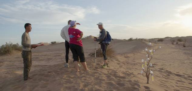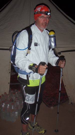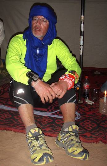 Une fois ravitaillé, je fais un brin de toilette... ça fait du bien de se sentir un peu plus frais, puis j'applique la pommade magique de Claude et le caleçon de Patrick... Et voilà un coureur neuf. La nuit est tombée, la température est de nouveau bonne, et il est temps de reprendre la route De CP11 à CP12 Départ de CP11 à 18h35 après une pause de 1h35 (51h42 depuis le départ). Pas de fantaisies sur cette section. Il y a une zone de dunes pour commencer, une zone plus facile ensuite et à nouveau une zone de dunes sur la fin. Il faut essayer de rester sur la piste le plus possible. Je pars donc sur la piste, pas trop difficile à suivre au départ. Il n'y a qu'un seul PI sur le tracé que je décide d'essayer de rejoindre. Rapidement la piste part dans des méandres et des directions fantaisistes par rapport à l'azimut du PI. Je décide donc de me caler directement sur le CP et de zapper le PI. Tant pis pour les dunes, je vais faire du tout droit. Finalement, les premières dunes passent plutôt bien. Soit je trouve des passages entre elles sur un sol dur, soit, avec l'aide des bâtons, je les passe sans difficulté. La zone n'est pas trop longue et je me retrouve rapidement sur le grand plateau intermédiaire. Là j'ai du mal à identifier le terrain. Fatigue + lune me perturbent et je mélange reliefs et zone sombres au sol. Finalement je prend le parti de continuer toujours tout droit sans me préoccuper du sol, et ça passe... Ce passage est assez long mais je gère au mieux jusqu'à l'apparition de la seconde zone de dunes. Ici rapidement la problématique est différente car les dunes sont franchement plus hautes et un peu plus difficiles à essayer de contourner (toujours avec l'éclairage de la lune). J'en passe plusieurs quand à un moment au loin je vois un feu de camp pile dans l'axe. Le GPS indique près de 3km, mais pas de doute en dehors du CP je ne vois pas qui pourrait faire du feu à cet endroit. Par contre 3km de grosses dunes, ça ne me dit rien de très bon, et je suis incapable de voir si celles-ci s'arrêtent avant le CP. Depuis un moment je vois sur ma droite une longue bordure d'arbres, un peu comme si il y avait une route avec des arbres tout le long. Vu mon état de fatigue, je me dit que je me fait des idées, que ce sont certainement encore des ombres qui me font cette illusion, et que si je vais par là je vair encore me retrouver au milieu de nulle part. Je continue encore un peu dans les dunes, mais, même avec les bâtons, la progression reste terriblement lente et les hectomètres n'avancent pas très vite. Seul point rassurant le feu reste visible à intervalles réguliers, comme quand on remet un peu de bois pour le relancer. Finalement je vais craquer. Tant pis si c'est une fausse impression, mais je décide quand même de tenter l'approche par la bordure d'arbres. L'avantage c'est que pour les rejoindre, je vais progresser dans le sens des dunes, et donc sans trop de difficultés. Plus je m'approche plus cette barrière d'arbre semble réelle... Finalement je n'ai peut-être pas rêvé. Globalement sur la fin je vois bien que ce n'est pas exactement une haie d'arbre telle que je me l'imaginais, mais quand même une zone plutôt dense. En arrivant sur zone je comprend pourquoi. Il s'agit en fait d'une sorte d'oued, d'où la présence de ces arbres. Là non seulement la progression est d'un coup beaucoup plus facile, mais la direction est globalement dans le bon sens et , cerise sur le gâteau, j'y trouve des traces de chaussures... Yes ! Ça va le faire... Je vais jusqu'à la sortie des dunes par l'oued, puis je retrouve une belle piste qui va vers le CP... Je m'en suis sorti. Le final est assez simple,e t je m'offre même le plaisir d'un dernier petit tout droit pour arriver enfin au CP. Arrivée à CP12 mercredi à 22h25 - 3h50 de course sur la section, et 62h15 depuis le départ - Temps estimé initialement 6h00 - 5ème position. Je me pose à l'extérieur du CP à côté du chef de poste. Il a effectivement fait un petit feu de bois et c'est bien cela que j'avais vu. Je lui dit qu'il faut qu'il continue et que cela se voit de loin.