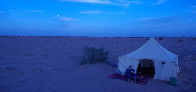 Il fait bon, alors je reste dehors le temps de me ravitailler. On est que tous les deux et du coup on discute un peu et on se boit un petit thé. Là planté au milieu du désert autour du feu la nuit... Je suis juste bien et j'en profite. Après m'être ravitaillé je me pose la question de me poser ici un peu ou d'aller jusqu'à CP13. Comme je commence quand même à pas mal fatiguer, je choisi de faire ma pause sommeil ici, ce qui me permettra d'attaquer la dernière section de nuit en étant un peu plus en forme, et ce qui ne remettra pas en cause mes objectifs de progression. Une petite demi heure après mon arrivée, Juju et Gérard arrivent à leur tour. Eux décident de se ravitailler ici puis de pousser jusqu'à CP13 pour se reposer. Comme les tentes ne sont pas très grandes cela conforte mon idée de dormir ici. Direction la tente où je me cale sous une couverture et où je m'endors toujours aussi rapidement. 1h45 plus tard je me réveille (juste un peu avant que la montre ne sonne). Pas facile de s'extirper de la chaleur de la couverture en pleine nuit, c'est plus facile lorsque le jour se lève. Je me prépare tranquillement, enfile le coupe vent pour le démarrage et je sors de la tente. Le chef de poste dors. Je rempli moi même la fiche de contrôle avec mon heure de départ, puis je le réveille quand même pour lui dire que je m'en vais et que j'ai rempli les papiers. Ca lui évitera de s'inquiéter. Avant de me coucher je lui ai demandé si la piste était praticable. l'interposte comporte plusieurs PI, et fait une grand S. Il me dit qu'on peut faire plus simple en coupant totalement hors piste et en rejoignant une piste qui relie CP3 à CP13... J'ai un peu de mal avec toutes les explications détaillées qu'il me donne et comme en plus c'est de nuit je décide de ne pas tenter le coup. Finalement je verrai après la course que j'ai probablement bien fait car la partie hors piste était longue et que si jamais on croise la bonne piste sans s'en rendre compte, là c'est la galère assurée. De CP12 à CP13 Départ de CP11 Jeudi à 01h20 après une pause de 2h55 (65h10 depuis le départ) dont 1h45 de sommeil (soit environ 5h30 de sommeil depuis le départ). Là je prend PI par PI. Je progresse sur la piste en contrôlant régulièrement les traces de pas par sécurité en me disant que les coureurs devant moi sont passés de jour et donc avaient moins de chances de se perdre. Je n'ai pas en mémoire toute la section, mais je me souviens que c'est probablement celle qui a du être la plus variée côté relief. Des montées des descentes des virages, mais comme il fait nuit j'ai un peu de mal à me faire une idée du paysage qui m'entoure. De toutes façons, la seule chose qui m'intéresse c'est de continuer à progresser sans me perdre. Je sais que je suis toujours pile dans mes temps et que, sauf erreur, il y a peu de raisons que ça ne passe pas. J'enchaîne les PI, zappant en général les derniers hectomètres pour passer au plus vite sur le PI suivant. Il y a un petit truc qui me turlupine quand même. Je sais que le PC13 est dans une zone de sable (on y avait fait les tests de la gestinette en 2009) et moi je progresse toujours dans un univers de cailloux. Le jour commence à se lever me redonnant un petit coup de boost. Les kilomètres fondent progressivement, et même sur le dernier kilo, je suis encore dans les cailloux. Me serais-je trompé ? 400m... Je décide de couper droit sur le CP dans un champs de cailloux, et voilà qu'au dernier moment je bascule dans une large cuvette sablonneuse où se trouve le CP. Je reconnais l'arbre au milieu. Ca y est j'y suis enfin.