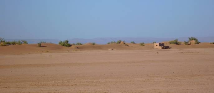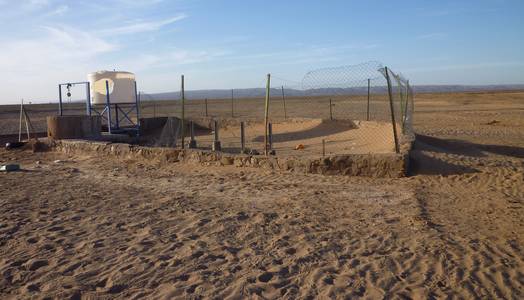 Je traverse un petit plateau, passe à proximité d'une cabane isolée, puis attaque la traversée des dunes. Ca passe bien, car celles ci sont espacées et de larges plaques de sol dur permettant de naviguer entre elles. J'avance correctement en me disant que dans cette direction je vais finir par trouver la piste. Par sécurité je me décide à contrôler ma position avec le GPS. Je me dit que sur les 6km initiaux, j'en ai fait 1,5 à contre sens, puis probablement 2 ou 3 en latéral. il doit donc m'en rester à peu près autant à faire, et là surprise... Le GPS m'indique moins de 2 km ! En fait contrairement à ce que je pensais, je ne suis pas en train de tout contourner, mais plutot de faire un trajet avec un simple angle ouvert, ce qui fait que, même avec le détours, je continue de me rapprocher du PI. Il y a aussi des bonnes nouvelles parfois. Et puis la navigation de jour avec la chaleur qui s'est calmée rend la progression agréable. Je me demande par contre comment Juju et Gérard vont gérer cela vu qu'ils risquent fort de repartir de nuit, et que là, les choix que j'ai fait ne seront pas forcément très lisibles... sauf si ils suivent mes traces de pas ! Je laisse le GPS allumé et vue la distance je pique droit sur le PI, je sors des petites dunes et je vois le puits et la cabane du PI... Yes c'est tout bon. Je termine en traversant une zone de cailloux et j'arrive au puits. Il ne m'a fallu que 1h25 pour venir ici contournement compris. Alain avait dit qu'il y aurait un contrôle, mais il n'y a rien de rien. pas même une feuille à signer ! Pour montrer que j'y suis bien passé et que je n'ai pas coupé, je fais une photo de l'endroit avec le soleil rasant (il faisait grand jour lors de notre passage lundi dernier).