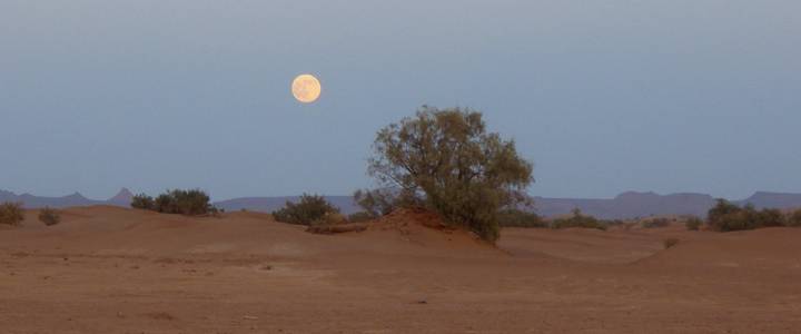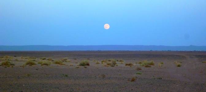 Départ de CP15 Jeudi à 20h30 après une pause de 0h36 (84h20 depuis le départ) Il y a plusieurs traces, mais finalement je trouve la vraie piste, bien marquée et sur laquelle je trouve encore des marques de pas. Le début est roulant et la piste bien lisible, donc pas de soucis. De temps en temps quand le sol est très dur les traces s'estompent, et la lune écrasant le relief, j'utilise la frontale au plus près du sol pour faire ressortir les ombres. Ca fonctionne pas trop mal. J'ai rapidement enlevé le coupe vent qui ne m'a servi qu'à me protéger de l'effet de froid lors de la sortie du CP. Je ne cherche pas à avancer super vite, j'ai plutôt envie de profiter un peu de cette dernière section. Quand on est en course on a qu'une hâte, c'est d'arriver, mais maintenant que j'arrive et que globalement je sais que je vais exploser mes objectifs, voilà que je suis d'un coup beaucoup moins pressé. Les premières dunes apparaissent. C'est là qu'il ne faut pas que je me plante. En gros soit on contourne la zone par une piste dérivant légèrement vers la droite de la ville, soit il faut contourner complètement par la gauche, mais là je ne sais pas exactement où s'arrête le zone de dunes.