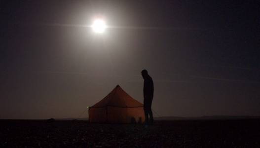 J'avance péniblement (c'est le bon mot) jusqu'au moment où je me trouve face à de grosses dunes. M.... qu'est-ce qu'elles font là celles là. J'aurais du trouver une piste avant d'arriver ici. Ou alors la piste est un peu plus loin derrière ces dunes. Pas le choix je dois passer. Je traverse une première dune, descend de l'autre côté mais pas de piste. Une seconde dune, une troisième une quatrième, c'est sans fin et surtout sans piste ... Il y a encore un bon bout pour rejoindre le CP, mais je n'ai pas le choix. Je n'ai aucune idée du meilleur endroit pour traverser, alors je reste sur le tout droit, façon sanglier. J'enchaine les dunes, m'enfonçant parfois jusqu'à mi-mollets, dans les descentes, même avec l'aide des bâtons. Les hectomètres n'avancent pas très vite et j'ai l'impression de passer ici un temps infini, d'autant qu'à chaque fois que je suis en haut d'une dune, j'en devine d'autres derrière, même si je reste méfiant la nuit avec mes impressions... J'arrive enfin sur une zone dure et plate que j'identifie comme étant le plateau du CP. je m'arrête, enlève et vide les chaussures, puis repars droit sur le CP. Ca ne dure pas longtemps. J'avais cru que c’était plat, et bien non, je retombe dans les dunes... Re-traversée des dunes, re-ensablage, et re-plateau dur. Pas d’affolement ce coup-ci, sauf que cette fois ça semble durer un peu. Au loin de vois une sorte de petite lumière... le CP??? et d'un coup deux gros points lumineux. Un 4x4. Là pas de doutes, je suis sorti des dunes. je re-vide mes chaussures et mes chaussettes, puis je file droit sur les phares qui sont dans l'axe indiqué par le GPS. Il reste encore un bon bout mais c'est enfin stable et plat. Les feux du 4x4 se mettent en mouvement. Dommage ça me faisait un bon point de repère. Du coup je fixe mon cap sur la lune. En me rapprochant je devine enfin les vagues lumières. Pas de doutes c'est le CP cette foi-ci. Je remonte au milieu des cailloux mais dans une zone relativement praticable, puis je trouve une pistouille qui me permet de rejoindre le CP