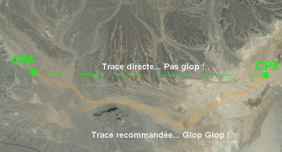 Plutôt que de partir plein ouest vers le CP6, il faut effectivement faire un large détour par le sud, ce qui allonge de plusieurs kilomètres, mais qui présente l'avantage de rester sur une piste théoriquement roulante. Par contre il ne faut pas se tromper de piste... Il m'indique également un gros massif rocheux au loin et me dit que je dois viser de passer au pied de celui-ci et qu'ensuite ce sera pratiquement tout droit. Vu d'ici, ça fait effectivement un joli détour.