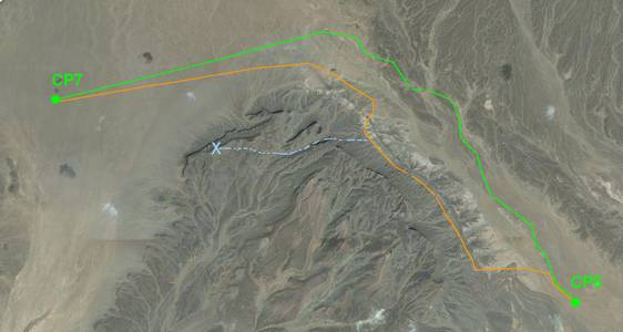Un peu sur la gauche de la piste une écurie de motards se préparent pour le Dakar. J'en salue 2 qui passent près de moi. Belle infrastructure avec tente technique, et véhicules d'assistance... Je continue de remonter tranquillement la piste sans trop de difficultés avant d'arriver enfin à CP6 Arrivée à CP6 mardi à 11h02 - 4h09 de course sur la section, et 26h52 depuis le départ - Temps estimé initialement 5h00 - Temps de 2009 : 4h30 - 7ème position. Bien content d'en avoir fini avec cette section, et surtout d'avoir contourné la difficulté. C'est vrai que d'attendre le lever du jour avant de quitter CP5 a été un bonne idée car à plusieurs reprises au début j'aurais pu prendre la mauvaise trace de nuit. Si on y ajoute l'heure de sommeil, ce n'est que du bénéfice, comme quoi je n'avais pas si bien géré les choses il y a 2 ans. Ravitaillement classique, je fais le plein d'eau car la prochaine section va être chaude, lorsque arrivent un véhicule des PAM. Cette fois ce sont Claude et Isa qui viennent aux nouvelles. Pour la seconde fois, je vais leur confier mes pieds. Le bilan n'est pas si mauvais que ça. Bon les pansements faits à CP3 sont en mauvais état (principalement à cause de la traversée dans le sable entre CP3 et CP4), mais il n'y a pas beaucoup de nouvelles ampoules. Il faut dire que je fais ce qu'il faut pour ménager mes pieds. Elles refont tous les pansements, traitent les petits nouveaux échauffements puis finissent par un surblindage en elasto. Objectif : il faut que ça tienne 5 à 6 PC... Elles m'indiquent aussi que William est en route pour CP6 et qu'elles se sont arrêtées en route pour le soigner. Thierry et Françoise sont plus loin derrière. Après cette remise en état je me prépare pour repartir, en pleine forme pour attaque la section de grosse chaleur. De CP6 à CP7 Départ de CP6 à 11h57 après une pause de 52mn (27h44 depuis le départ). Que dire de cette section ? D'abord elle comporte 4 PI, PI qui empruntent dans un premier temps une piste qui contourne par le nord, puis qui traversent une zone sablonneuse avant de terminer par une très longue traversée de plaine rocailleuse totalement plate (tracé en vert sur la carte). J'en garde un souvenir assez difficile. J'avais souffert de la chaleur pendant toute la section, probablement accentué par le manque de sommeil et mes problèmes de dos. Je me souviens aussi du récit de certains coureurs qui étaient passés presque en direct et qui s'en étaient bien sortis. Je décide donc de tenter le tout pour le tout et de zapper les 4 PI.