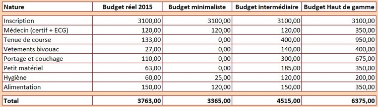 Il faut bien reconnaître que le budget pour une telle participation est loin d'être annodin. Vu le niveau d'accéssibilité de l'épreuve, C'est même probablement le frein principal pour beaucoup de coureurs. Le but n'est pas de savoir si le coût est justifié ou trop élevé. Ca pourra faire l'objet d'une autre discussion. Non, ici on va partir du principe que vous avez décidé de participer et que vous devez construire votre budget en conséquences. Il n'existe pas un budget unique, mais plutôt des situations et des hypothèses de départs qui influent sur la construction de ce budget suivant que vous soyez sponsorisé ou non, par un équipementier ou par une entreprise extérieure au mileiu de la course à pied, votre expérience des raids et donc l'équipement de départ don vous disposez déjà,... Je vais partir de ma situation qui est certainement assez proche de celle de beaucoup de coureurs de milieu de peloton, et à partir de là je vous exposerai les variations possibles. Pour faire simple, le Marathon des Sables 2015 m'a coûté 3763 euros, ce qui veut dire que si je retire les 3100 euros d'inscription, les coûts additionels sont de 663 euros. Cela s'explique par le fait que je disposais déjà d'une grande partie du matériel, et que dans certains cas, je me suis fait prêter certaines choses comme le sac de couchage ce qui a limité les dépenses. Sur la base du découpage des rubriques que j'ai déjà utilisé lors de la préparation, voici ce que cela donne 1°) Inscription => 3100,00 euros 2°) Médecin (certif + ECG) => 120,00 euros 3°) Tenue de course => 133,00 euros 4°) Vêtements bivouac => 27,00 euros 5°) Portage et couchage => 110,00 euros 6°) Petit matériel => 63,00 euros 7°) Hygiène => 60,00 euros 8°) Alimentation => 150,00 euros Ces montants peuvent parfois paraître faibles, alors on va passer les rubriques en détail 1°) Les frais d'inscription (3100,00 euros) Pas de discussion possible. En 2015 c'était 3100 euros, et la tendance est à une augmentation d'environ 100 euros par an. 2°) Les frais médicaux (120,00 euros) 120 euros pour obtenir le certificat médical, mais surtout pour l'ECG obligatoire. Remboursés par la sécurité sociale, alors j'aurais pu ne pas les faire apparaître, mais c'est quand même un montant à ne pas oublier. 3°) La tenue de course (123,00 euros) Rappel de la composition Chaussures => 0,00 Chaussettes => 7,00 Guêtres => 6,00 Corsair => 0,00 Manchons => 40,00 Slip => 30,00 Maillot => 0,00 Manchettes => 0,00 Cheche => 0,00 Lunettes => 0,00 Bâtons => 50,00 Gants => 0,00 Lentilles => 0,00 Montre => 0,00 Epingles => 0,00 Dossard => 0,00 Le gros poste est en général les chaussures. Il n'est pas nécessaire d'investir dans une paire spéciale MDS, la course ne présente aucune particularité technique. Pour ma part j'avais une paire de Hoka Mafate avec lesquelle j'avais fait l'Ultra Marin et qui me semblaient bien adaptées au terrain. Pour les chaussettes, j'ai utilisé une simple paire de chaussette de trail de chez Décathlon. Pas besoin de plus puisque j'ai géré la protection de mes pieds directement avec de l'elasto. Pour les guêtre, j'ai acheté les nouvelles Guêtres de chez Raidlight, celles avec l'avant renforcé pour résister aux pierres. Elle valent 25 euros, mais je les ai payées avec un bon d'achat que j'avais en stock chez Raidlight. Du coup je n'ai payé que le port. J'ai changé mes manchons de compression. 40,00 euros Pour le sous-vêtement j'ai investit dans un "Craft" à 30,00 euros. Un peu cher mais vraiment très supportable. N'oubliez pas que vous allez le porter une semaine ! J'ai acheté des batons plus légers que mes habituels bâtons de trail. Rapport qualité/prix/poids imbattable. 50,00 euros la paire. Pour tout le reste, je n'ai fait que réutiliser de l'équipement que j'avais déjà en stock. Cuissard, tee shirt, cheche... rien ne sert de prendre du matériel spécial désert. On a tous ce qu'il faut dans nos tiroirs. 4°) La tenue de rechange (27,00 euros) Rappel de la composition Sandales => 0,00 Sur chaussures => 0,00 Chaussettes => 7,00 Cuissard => 0,00 Pantalon tyvek => 10,00 Veste tyvek => 10,00 Tee shirt nuit MC => 0,00 Tee shirt ML => 0,00 Buff => 0,00 Gants en soie => 0,00 Pour les chaussettes, c'est le même modèle que celles de la tenue de course. La veste et le pantalon en tyvek. Probablement le meilleur rapport prix/efficacité. A 20 euros l'ensemble, c'était vraiment le top cet année en regard des conditions climatiques que nous avons eues (vent) Tout le reste je l'avais déjà. 5°) Portage et couchage (110,00 euros) c'est un poste qui peut rapidement grimper à plusieurs centaines d'euros suivant les choix de matériel qu'on décidera de faire. Rappel de la composition Sac Raidlight Olmo 20L => 110,00 Portes bidons => 0,00 2 Bidons 750ml => 0,00 Bidon souple => 0,00 Matelas => 0,00 Lacet => 0,00 Sac de couchage Lestra Alpilles Light => 0,00 Sac à viande en soie => 0,00 J'ai investit uniquement dans le sac, mon ancien 20L décathlon étant beaucoup plus lourd et un peu moins confortable. J'ai pris le sac 20L sans pack avant (inutile). Du coup les portes bidons et les bidons étaient inclus avec, donc pas d'acaht supplémentaire. Pour le matelas j'ai recyclé un vieux tapis de gym que j'ai découpé, mais certains osent aussi partir sans matelas. Pour le sac de couchage, j'ai eu la chance de m'en faire prêter un par Guy et Christine, sac qui s'est avéré être au top par rapport aux conditions qu'on a pu avoir cette année. J'ai juste ajouté un sac à viande en soie que j'avais déjà. 6°) Petit matériel (63,00 euros) Frontale => 0,00 Frontale 2 => 6,00 Boussole => 0,00 Briquet => 1,50 Sifflet => 0,00 Couteau => 14,50 Miroir => 0,00 Couverture de survie => 0,00 200 euros => 0,00 Pinces => 0,00 Lunettes => 0,00 Couverts => 0,00 Esbit => 0,00 Réchaud => 0,00 Gamelle => 34,00 Kit couture => 0,00 Crayon => 0,00 Passeport => 0,00 CB => 0,00 Super glue => 0,00