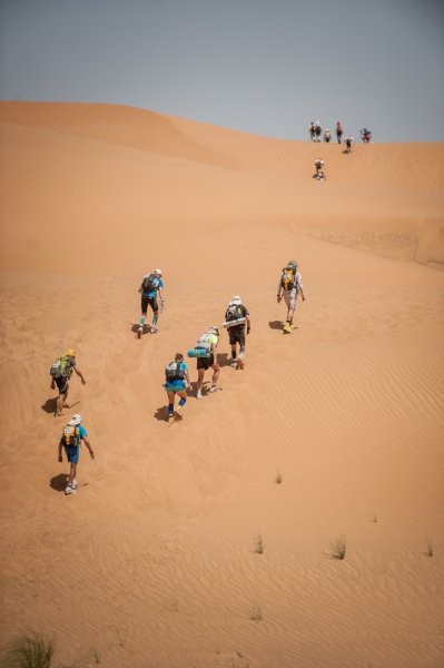 Fin de l'épisode VII "Je m'installe le plus confortablement possible en essayant de me protéger du vent le mieux possible et je me lance dans une nouvelle nuit que j'espère récupératrice" Malheureusement cette nuit là sera tout sauf calme. Le vent encore et encore mais cette fois les tentes n'y résisteront pas. Malgré plusieurs tentatives pour limiter la prise au vent, elle finira par nous tomber sur la tête pendant la nuit. Que faire ? Rien ! Au moins quand elle est étalée sur nous, on est protégé du vent, alors je ne bouge pas de mon sac de couchage et je fini ma nuit comme ça... Comme les autres chevaliers trailer. Vendredi 10 avril 2015, calendrier local - 05h00 GMT Finalement le réveil se fera de la même façon que les autres jours. Tranquille, reposé, on remet la tente un peu plus verticale, et on reprend les activités matinales. Petit déjeuner, préparation du sac qui est maintenant vraiment léger, récupération de l'eau... la routine quoi ! Aujourd'hui ce n'est pas n'importe quelle étape, c'est l'étape marathon. Ca parait simple un marathon, mais il ne faut pas oublier que juste derrière l'étape longue, cette étape sera la seconde plus longue de la course. Par contre par habitude c'est généralement une étape dite "roulante" Seconde particularité, c'est que cette étape marquera la fin de la course officielle, la 6ème étape étant désormais une sorte de ni-ni. Un No man's land avec une étape chronométrée mais non prise en compte dans le classement ! On en reparlera demain. Il y aura aujourd'hui 3 CP à valider avant d'aller sur l'arrivée, et cette année, le départ se fera, comme pour la longue, en 2 vagues. D'abord le gros du peloton (qui a dit que j'étais gros ?), puis les 200 premiers au classement général qui partiront 1h30 derrière nous.