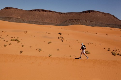 Plusieurs paramètres sont à prendre en compte : - Le classement visé ! On ne va pas progresser de la même façon suivant qu'on vise le top100 ou qu'on se fixe comme objectif de terminer la course. - L'entrainement. Courir 240km dans le désert, ça ne s'improvise pas - Les conditions de course. Une montée dans le djebel à 14h00 et une section plate à 9h00 ne se gèrent pas de la même façon - L'enchaînement des journées. On est plus frais le premier jour que le 5ème. Il est clair que sur les ultras en général, on rencontre un nombre de marcheurs assez important. Que ce soit en raison du dénivelé, de la chaleur ou tout simplement de la fatigue, la proportion de purs coureurs reste très faible en général. A partir de là, et, dans le cas du Marathon des Sables, si on exclut les extrêmes (disons le top 50 à l'avant et à l'arrière du peloton) on sera tous amené à marcher à un moment ou à un autre. C'est vrai que la marche permet de revenir dans une zone de confort physique. Pour celles ou ceux dont l'objectif n'est que de terminer la course, la largeur des barrières horaires leur permet d'envisager sereinement ce mode de progression (ce qui n'est pas le cas sur tous les ultras). La difficulté est que lorsqu'on a touché à ce confort, il est parfois difficile de relancer la machine pour courir à nouveau. Faut il courir tant qu'on peut et marcher ensuite ? Faut il alterner marche et course sur un timing pré-défini dès le début de l'épreuve ? A mon sens (et vu mon niveau) je vais privilégier des sections de marche assez tôt probablement; mais à la différence de ce qu'on peut faire sur un 100 bornes ou un 24 heures en rythmant cette alternance (par exemple 1mn de marche pour 9mn de course), c'est la nature du terrain et les conditions météos qui vont décider de cela. Il ne faut pas oublier également que si la marche est plus confortable pendant l'épreuve, elle va obliger à passer plus de temps en course, généralement dans la période de chaleur, et du coup on a moins de temps au bivouac pour récupérer. Il y a donc un équilibre propre à chacun à trouver. Le classement visé Clairement la stratégie de répartition marche/course ne sera pas la même suivant l'objectif que vous vous êtes assignés. Si vous visez un top 100 (ou top 50 ou top 200...) il va vous falloir courir un maximum à chaque fois que le terrain le permet. Pas forcément très vite, mais souvent (enfin quand même pour le top 50 il faudra courir vite et longtemps). Plus vous allez vous rapprocher du Top, plus il vous faudra déployer des capacités proche de celles de la gazelle. Dans ce cadre là, vous êtes un compétiteur pur et dur, et biens sur vous êtes là pour courir. Point barre ! Du coup vous allez limiter au maximum les sections de marche. Si vous êtes dans cette catégorie, bien sûr, la suite de ce billet ne vous concerne que de très très loin. L'entrainement Suivant le type et le volume de préparation vous serez forcément plus ou moins en mesure de courir longtemps. Ca semble évident mais ça va toujours mieux en le disant. Au delà d'un entrainement permettant à courir longtemps, il faut aussi travailler la capacité à récupérer rapidement. L'utilisation du sommeil flash par exemple sur la longue peut éviter de devoir s'arrêter une heure ou deux pour dormir. Faire du fractionné et des côtes favorisera le renforcement musculaire au niveau des cuisses et vous permettra peut-être de repartir plus facilement et de moins marcher après avoir monté un djebel. Bref l'endurance seule n'est pas suffisante pour se préparer au MDS Les conditions Le Marathon des Sables se fait en partie dans ... le sable. En fait ce n'est pas la plus grande partie du tracé qui est couvert de dunes, mais il y en a quand même pas mal. Il est clair que lorsqu'on est dans des dunes sans portance (suivant les dunes certaines sont très stables et permettent de courir et dans d'autres on s'enlise jusqu'au mollet) il est souvent préférable de marcher ne serait-ce que pour s'économiser. Même chose dans la montée des djebels. Difficile de courir dans les côtes au risque d'y laisser des plumes rapidement. Mieux vaut y aller tranquillement et garder du jus pour pouvoir repartir le plus rapidement possible une fois en haut.