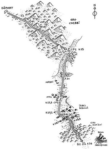 Le désert est un univers un peu particulier qui rend souvent compliqué le balisage d'un tracé. Les pistes utilisées par les véhicules ont tendance à se déplacer au gré du vent et du sable, alors que peut-il advenir de la trace de quelques coureurs ? Au cours de ces dernières années, j'ai rencontré plusieurs types de balisage sur ce type d'épreuve. Sur la Mauritanienne Race, on avait un balisage physique, c'est à dire que de la rubalise était placée à chaque fois que cela était possible (arbustes, herbe à chameaux,...) et le reste du temps, il y avait des dizaines de cailloux, peints en blanc, un peu comme si on suivait la piste du petit poucet. Pour les sections de nuit, des bâtons lumineux étaient placés tous les 200-300 mètres. C'est un balisage de qualité, mais qui présente des difficultés. Par exemple, si vous vous éloignez de quelques mètres de la piste vous pouvez très vite être perdu sans savoir dans quelle direction aller pour retrouver la trace. De plus, pendant la course, on a essuyé une tempête de sable rendant la visibilité nulle, et surtout le sable avec des vents assez forts avait complètement bouffé la rubalise. Petite astuce pratique. Lorsque vous vous arrêtez pour faire une pause ou satisfaire à un besoin naturel, pensez toujours à poser quelque chose (votre sac, ou vos bâtons) dans la direction vers laquelle vous voulez aller. On a déjà vu des coureurs faire une pose "pipi" et repartir en suivant le balisage... dans le mauvais sens ! Sur la Trans333, il n'y a pas, ou en tous cas très peu, de balisage physique. La progression se fait uniquement au GPS. Ca peut sembler compliqué au premier coup d'oeil mais en fait je me suis rendu compte que la grande souplesse et de la sécurité que cela apportait. Plus question de se perdre. Même si on s'éloigne de la piste, la GPS continue d'indiquer la direction vers le point suivant. On peut s'éloigner d'un oued ensablé pour aller chercher un terrain plus dur 100m sur le côté sans risquer de se perdre. Même chose en cas de météo défavorable. Le GPS n'est en général pas impacté par les conditions externes. Et pour les pauses techniques, plus de risque de repartir en arrière. La contrainte, c'est de disposer d'un GPS. Un coût non négligeable que certains organisateurs hésitent à imposer aux participants, d'autant que sur les courses longues, il faut partir avec des modèles à piles, les GPS à accus n'ayant pas l'autonomie nécessaire et les chargeurs solaires présentant un ratio poids/efficacité assez moyen. Tout ça pour dire que l'option retenue sur le MDS est le balisage physique, associé à la fourniture d'un Road book détaillé. Le balisage de jour Le parcours est indiqué par des balises tous les 500 mètres environ. Ca peut faire long, mais disons que ce sont surtout des points de repères ou de confirmation qu'on est pas sortie de la piste. Les indications du Road book permettent de conserver un axe de progression correct, sachant qu'on est pas dans une course d'orientation, et que le but n'est pas de piéger les participants. Un autre point est aussi à considérer, c'est le nombre de participants. Avec 1300 concurrents, à moins d'être dans les premiers (ce qui a peu de chance d'être mon cas), on va surtout être amené à suivre une file de coureurs, et dans le cas où on ne verrait personne devant, les quelques centaines de coureurs qui nous auront précédé auront laisser des marques bien visibles ! Reste le cas de la mauvaise météo. Là, la consigne de l'organisation est claire "En cas de vent de sable ne permettant aucune visibilité, chaque concurrent devra stopper sur l'axe du parcours et devra attendre les instructions des commissaires de course". C'est la meilleure solution de toutes façons. Vous sortez la couverture de survie, vous vous abritez et vous attendez que ça passe. On est dans un cadre avec une grosse assistance, dont il y a peu de chances qu'on nous abandonne pendant 2 jours ! Le balisage de nuit Sur l'étape longue où on est certain de courir de nuit, même principe que pour le balisage de jour mais avec des un balisage lumineux disponible depuis le CP3 ou CP4 suivant les horaires, et jusqu'à l'arrivée. Autre point très utile, chaque concurrent porte un baton lumineux accroché sur son sac à dos, ce qui, si jamais on se trouve dans une zone de dune et qu'on ne voit pas le balisage fixe suivant, permet de suivre d'autres concurrents à la trace. L'expérience 2015 m'a démontré l'efficacité de ce dispositif sur lequel j'étais au départ assez sceptique. Le road book Autant sur des courses comme l'UTMB, l'omniprésence du balisage rend difficile le fait de perdre le chemin ce qui fait que le road book sert surtout à préparer sa course. Sur toutes les éditions auxquelles j'ai participé, je n'ai jamais eu besoins de le sortir, autant sur le MDS il y a un véritable intérêt à l'emporter, et pas uniquement parce qu'il fait partie du matériel obligatoire. Chaque matin, lors du briefing, la direction de course donne des indications complémentaires ou des précisions sur certains passages. Le road book se compose de 3 éléments principaux qui se complètent. - Une carte sur laquelle figure le tracé de l'étape avec les CP, les azimuts de progression,... - Des schémas simples et assez clairs permettant de matérialiser les points clés de la progression - Une description texte des éléments particuliers qui seront rencontrés et des axes de progression à suivre La carte globale est un élément qui permet de se faire une idée du parcours de la journée.
