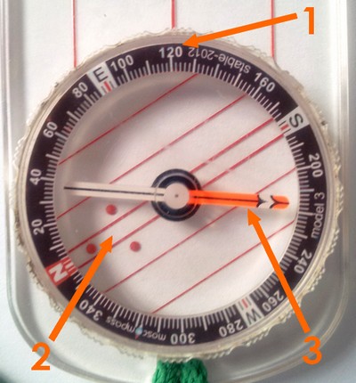 - Maintenez toujours votre boussole bien à plat dans la paume de votre main et éloignée de toute masse métallique. Il n'y a que dans les film où vous verrez quelqu'un prendre un cap avec sa carte posée sur le capot d'une voiture. Là vous avez toutes les chances de partir dans la mauvaise direction. - Faites tourner le cadran mobile de votre boussole de façon à positionner la graduation correspondant à 120 sur le repère fixe de votre boussole (1).On peut remarquer que les repères du nord (2), et la partie de l'aiguille indiquant le nord (3) ne sont pas du tout alignés.