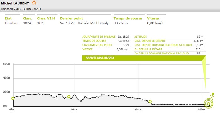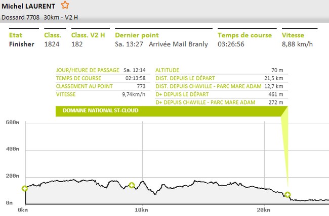 Arrivée au ravitaillement de Saint-Cloud situé au km 21,5 en 2h13 ce qui me donne une allure moyenne de 9,7 km/h. Finalement le rythme n'a pas baissé ce qui devrait me permettre de gérer très calmement la fin. Je m'arrête quelques instants histoire de boire un verre de coca et de manger quelques tucs, et je repars sans trop trainer. J'ai très peu bu en j'ai encore de la réserve dans le sac pour tenir jusqu'au bout.