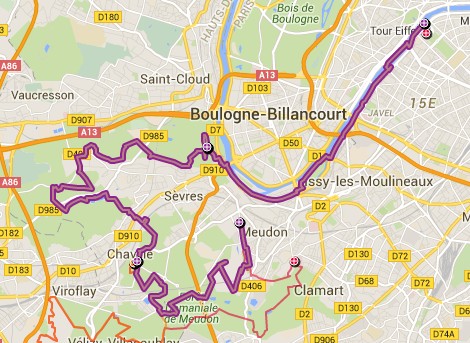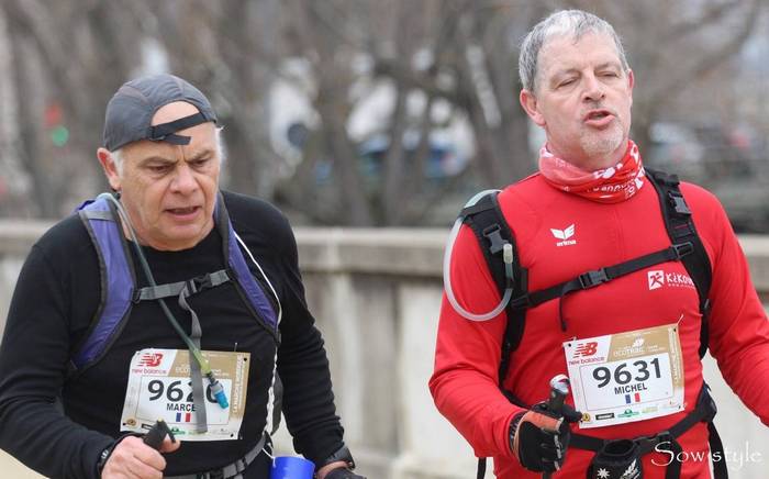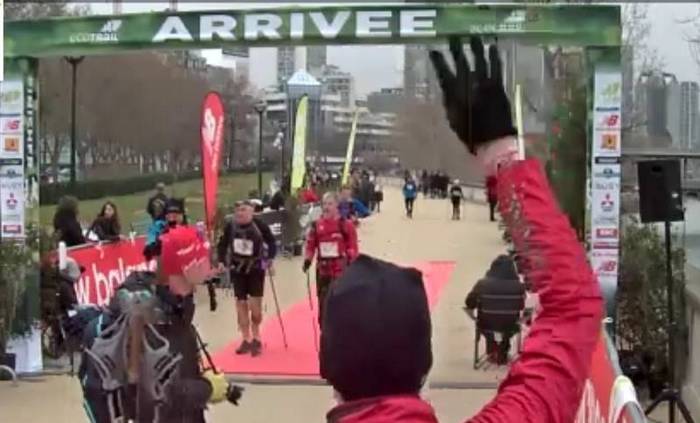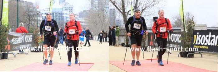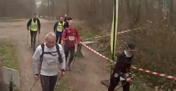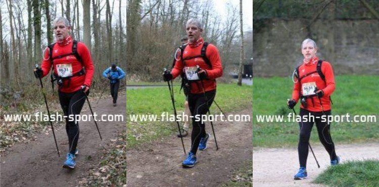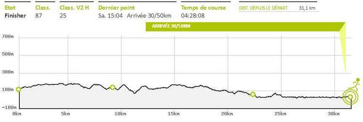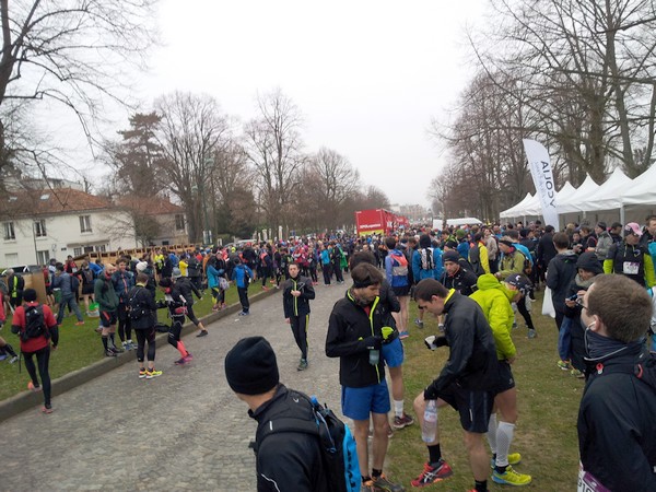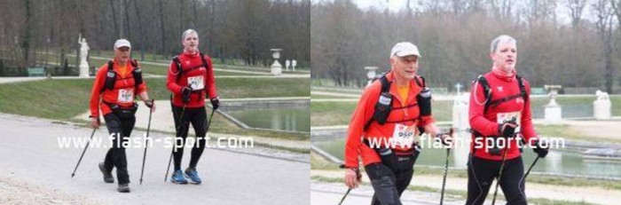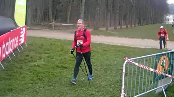 Ecotrail de Paname… Version "Marche Nordique" ! Entre temps j'ai poursuivi les investigations pour essayer de remettre la machine en état, et en janvier, alors que j'accompagne le Bagnard comme bénévole sur le Raid28, Sarah, une camarade de club, me propose de passer la voir à son cabinet de chiropracteur. Au point où j'en suis, me faire remettre en place cervicales, lombaires et autres osselets ne pourra pas me faire de mal. Je me suis d'ailleurs rendu compte que au delà de 1h30 de MN, mon nerf sciatique dans la jambe droite se réveillait... Donc quand je cours j'ai mal à gauche et quand je marche j'ai mal à droite. On est pas gâté ! Après quelques séances les premiers résultats sont encourageants. J'ai réussi à recourir 35mn sans douleur, mais avec l'Ecotrail qui approche je n'ai pas pu confirmer en renouvelant ça une ou deux fois. Par contre j'ai réussi à faire une sortie de 1h30 de MN sans aucune douleur dans la fesse droite. J'allège l'entraînement sur la dernière semaine avec juste une petite sortie le mercredi matin. Tous les voyants semblent au vert Je décide d'aller au départ à Meudon plus tôt que l'heure de mon départ prévu à 10h30 de façon à pourvoir voir les copains qui partent dès 10h00 sur le 30km course. Contrairement à l'an dernier où j'étais allé au départ en transports directement depuis la maison, là je décide d'aller me garer à la Tour Eiffel, puis de prendre le RERC et le Tram pour revenir sur Meudon. J'ai un souvenir difficile de retour par les transports l'an dernier avec ma jambe en vrac. J'ai déjà communiqué mon objectif initial, faire moins de 5 heures, ce qui correspond à +30% du temps de Christian (le vainqueur en 3h50) l'an dernier. La même proportion rapportée au marathon de Paris (2h10) me ferais courir en... 2h50... Hé oui, 30% du temps du premier c'est chaud bouillant ! Le soucis c'est que entre temps, Bert' est venu me titiller en me disant que Arnaud Tsamere avait mis 4h30 l'an dernier... Je ne relève pas mais quand même... En ce qui concerne le sac, j'ai pris mon vieux DK 5L avec dedans une poche à eau de 2 litres qui devrait me permettre de ne pas avoir à me ravitailler en route, et bien sur le matériel obligatoire (couverture de survie,...) et le coupe vent. Côté ravitaillement, j'ai mis un peu de poudre de perlimpimpin dans la poche et j'emporte juste 3 gels pour gérer les coups de mou. Bien sur j'ai pris mes jolis bâtons KV+, avec des gants en soie et des gants de VTT pour éviter les frottements des gantelets. Avec 250 participants, il n'y aura qu'une seule vague de départ. 10h38, le départ est donné. Comme tous les autres parcours qui partent de Meudon, on commence par l'avenue du château, une jolie montée sur les pavés. On est encore serrés et avec les bâtons pour être plus à l'aise je décide de partir dans la contre allée en herbe. Au moins ça permet de faire monter la température de la machine dès le départ. Comme je n'ai aucun repère chrono, je décide de ne pas lancer le chrono, et de ne pas regarder la montre pendant la course. Je vais gérer cette première épreuve uniquement aux sensations, de façon à avoir une base fiable si un jour je devais y revenir. Arrivé en haut on rentre dans le parc de l'observatoire et à partie de là je ne vais plus être gêné. Les marcheurs se sont étalés, et je peux progresser à mon allure facilement. La première partie ne pose pas de problème. Petit à petit je cale mon rythme en essayant de ne pas me laisser entraîner et assez rapidement les positions se stabilisent. Vers le 2ème ou 3ème kilomètre je fais un petit bout avec un autre marcheur qui m'explique qu'il a les boules parce que l'an dernier il était dans un groupe qui s'est perdu. Heu ! Attends ! Tu veux dire que tu étais dans le groupe de tête ? Là je me dis que je suis peut-être parti un peu vite... On attaque les premières petites montagnes russes avec des juges aux allures qui nous surveillent. On les reverra un peu plus loin puis plus rien jusqu'à l'arrivée ! On attaque la première montée du circuit bien droite comme je ne les aime pas. En fait je n'aime pas les montées tout court ! Du coup, je regarde mes pieds, je me penche en avant et j'optimise au maximum l'utilisation de mes bâtons, et là, étrangement je remonte plein de marcheurs ! Et même certains marcheurs/coureurs qui désormais ne peuvent que marcher. Comme toujours sur l'Ecotrail, chaque montée est suivie par une longue partie permettant de récupérer. Un peu plus loin on a le droit à un long faux plat montant. Pour une fois je suis content d'être en mode marche car c'est exactement le genre de terrain sur lequel j'ai du mal à me positionner lorsque je suis en mode course. La montée n'est pas assez raide pour justifier de marcher et est trop raide pour que je puisse la passer sereinement en courant. Aujourd'hui la question ne se pose pas et je la mange tranquillement, toujours bien penché en avant pour optimiser mes appuis sur les bâtons. Depuis le départ je n'ai jamais regardé la montre et je décide de continuer de cette façon là. Je n'ai pas de repère d'allure, pas de repère kilométrique fiable, alors à quoi bon tirer des plans sur la comète chrono ? Après course en regardant les fichiers fournis par l'organisation, je verrai que je suis passé à ce pointage en 1h11. Pas question de se laisser aller. On repart dans les enchaînements de chemins et de sentiers. Je reconnais pas mal des endroits où on est passés l'an dernier, mais je n'arrive pas à projeter la suite du parcours. Autant en CO je mémorise absolument tout, autant là j'ai de gros trous. Bon de toute façon je prends le terrain comme il vient sans me poser de question en attendant d'arriver au ravitaillement de St Cloud. On trouve les premiers panneaux Kikourou d'encouragement et même un peu plus loin un panneau nous indiquant la "presque" dernière côte. Ben voyons... Patrick, il va falloir 
