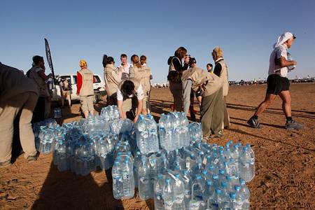 On l'a vu, même si le Marathon des Sables est une course en milieu désertique, il n'en demeure pas moins que la fourniture en eau est un des points sur lesquels l'organisation ne prend pas de risque. On va donc avoir un approvisionnement régulier ce qui va permettre d'éviter de se surcharger inutilement. Il est clair que quand on découvre ce type d'épreuve on a tendance à vouloir prendre beaucoup d'eau avec soi. C'est dans un phénomène de réaction normal qui associe le désert avec la chaleur et donc la soif.
