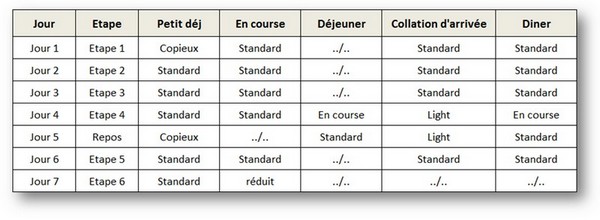 Avant de s'attarder sur le choix de tel ou tel plat, il faut avant tout définir sa stratégie d'alimentation. Pendant ces 7 jours, vous allez manger combien de fois ? Des part normales, réduites ou au contraire renforcées ? Quelle stratégie pour la collation ? Pour le petit déjeuner ? Pour l'étape longue ? Bref avant de choisir la couleur du papier peint, on va déjà construire les murs. Le plus simple est probablement de partir sur une journée "type" et ensuite de l'adapter au contexte des étapes lorsque c'est nécessaire. Pour la journée type, on peut prendre comme base d'alimentation - un petit déjeuner - un ravitaillement d'appoint pendant la course - une collation à l'arrivée - un repas pour le soir Cette structure va s'appliquer sur tous les jours de course avec quelques adaptations : - Le premier jour où le petit déjeuner n'étant pas "porté", on peut l'enrichir un peu - l'étape longue avec un repas du soir qui se fera sur la route et donc un équilibre déjeuner-diner à trouver. - La journée de récupération après la longue où on peut vraiment faire petit déjeuner, déjeuner, collation et diner au bivouac - Le dernier jour, où on se limitera au petit déjeuner En synthèse cela peut se traduire de la façon suivante