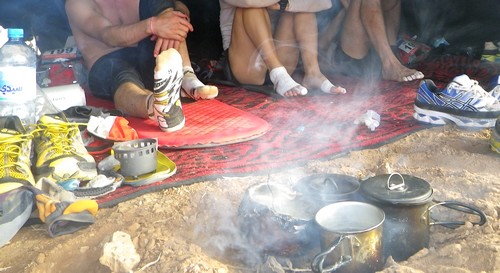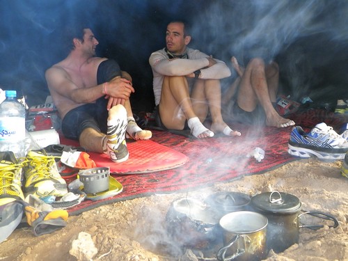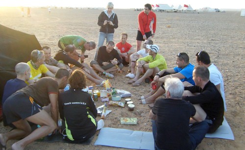 Petit déjeuner : Un moment important. C'est le principal repas qui va nous alimenter pendant la course. De plus avec des départs vers 9h ou 10h, le déjeuner sera remplacé par le grignotage de course, donc autant bien s'alimenter tôt le matin pour éviter fringales et baisses de forme pendant la journée. En course : Le ravitaillement pendant la course va vraiment dépendre des habitudes des uns et des autres. C'est essentiellement un complément très ponctuel, mais assez loin de pouvoir remplacer un vrai déjeuner. Collation d'arrivée : Etant donné qu'on ne déjeune pas, il est important de prévoir une bonne collation à l'arrivée de l'étape. Cela permet de se refaire sans avoir à attendre le soir, mais également d'étaler un peu la prise d'alimentation pour faciliter la digestion. Diner : C'est le repas d'équipe. Le matin aussi on déjeune tous ensemble, mais quand on est plus ou moins réveillé ce n'est pas la même chose. Là une fois que tout le monde est arrivé au bout de son étape et a récupéré, on va prendre le temps de se poser autour du feu pour refaire la course tout en reconstituant les réserves. Il faut quand même rester raisonnable sur ce repas car on va aller se coucher rapidement après, et du coup c'est la digestion qui risque d'en souffrir. D'où l'importance de la collation qui aura été prise quelques heures avant et dont la digestion sera déjà bien avancée.