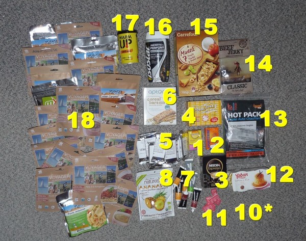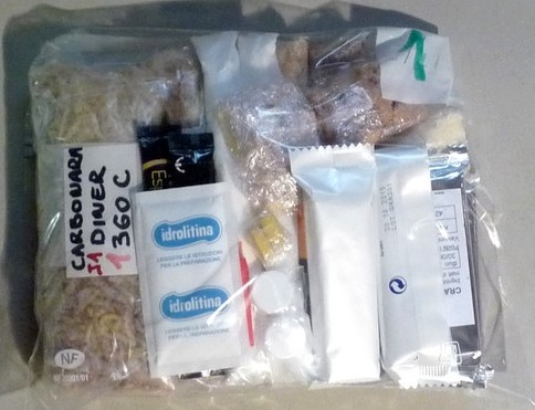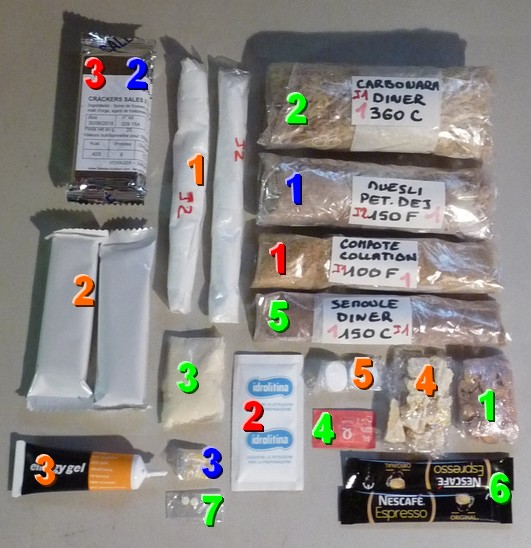 2 - Sportenine 3 - Dosettes café 4 - Idrolitina (eau gazeuse) 5 - Crakers salés 6 - Barres céréales 7 - Gels 8 - Ananas séché 10 - Noix de cajou (manquantes) 11 - sel 12 - Gateau de riz (1er jour) 13 - Petit dejeuner auto chauffant (1er jour) 14 - Viande séchée 15 - Muesli 16 - Isostar neutre 17 - Café autochauffant (1er jour) 18 - PLats lyo L'alimentation en détail