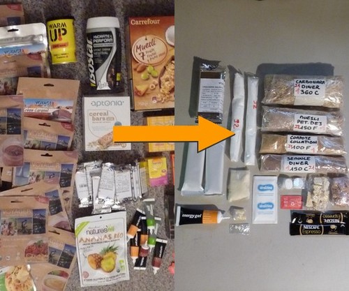 1 - Compote de pommes. Comme tous les plats lyo, je remplace l'emballage en aluminium par un sac congélation. J'utilise des sac 1 litre, sans zip, car pour les petits plats comme les compotes, je recoupe les sac d'environ 40%. Une fois le plat dans le sac, je le roule et je le ferme avec du ruban adhésif. De toute façon, une fois utilisé l'emballage n'est pas réutilisé. Sur le sac je colle une étiquette avec le plat, le repas (ici collation) et les informations pour l'eau. Ici 100F signifie que ce plat se réhydrate avec 100ml d'eau Froide Les marques rouges correspondent au n° de sac (1) et au jour concerné (J1). 2 - Sachet d'idrolitina pour faire de l'eau gazeuse. Je le conserve dans son emballage d'origine 3 - 2 Crackers. Là aussi, comme ils sont déjà emballés par 2 je conserve l'emballage d'origine. Le repas du soir (chiffres verts) 1 - Noix de cajou. 20g emballées dans du film alimentaire pour l'apéritif. 2 - Le plat principal, ici des pâtes carbonara. Même principe que pour la compote. Ici on a 360C pour 360ml d'eau chaude. 3 - Du parmesan râpé. Petit plaisir pour mettre sur les pâtes. Emballé dans un mini sachet plastique fait maison. 4 - Un sachet de sel 5 - Le dessert, ici un gâteau de semoule. 6 - Deux dosettes individuelles de café 7 - 2 sucrettes pour le café, emballées dans du film alimentaire Le petit déjeuner (chiffres bleus) 1 - 1 sachet de muesli maison (muesli, + lait + chocolat + pralin) le tout emballé dans un sac congélation comme les plats lyo. 2 - 2 crackers (idem ceux de la collation) 3 - 2 supradyn Intensia emballés dans du film alimentaire Le ravitaillement pour l'étape du jour (chiffres oranges) 1 - 2 x 25g de poudre énergétique reconditionnés dans des sacs congélation 2 - 2 barres céréales emballées individuellement 3 - 1 gel énergétique 4 - De l'ananas séché, reconditionné dans du film alimentaire 5 - 2 cachets de sporténine emballés individuellement dans du film alimentaire Voilà, avec ça je dois tenir 24 heures, et recommencer la même chose chaque jour Retour d'expérience