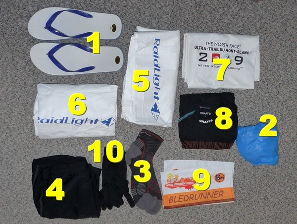 En fait la tenue de bivouac va être la tenue complémentaire par rapport à la tenue de course dans le sens où, sur la durée de la course, on a besoin d'avoir du long et du court. Etant donné qu'on ne peut pas multiplier les vêtements à emporter, on va donc jouer sur à fond la complémentarité entre tenue de course et tenue de bivouac. Pour faire simple on a besoin d'emporter une tenue pour les périodes chaudes (journée ou une partie du temps sur le bivouac), mais aussi une tenue un peu plus chaude pour la nuit, le petit matin, et aussi pour l'étape longue Il faut aussi prendre en compte une protection contre le vent. Pour la pluie, le cas étant assez rare, cela fera partie du matériel optionnel auquel on ne s'intéressera que le moment venu si c'est nécessaire. En général, la tenue de bivouac se compose des éléments suivants. Pour le haut du corps : - micro-polaire ou T-shirt technique - et si besoin pour le soir blouson tyvek ou coupe-vent. L'objectif est d'avoir une tenue permettant de résister à la fraicheur du soir et/ou de la nuit, mais qui servira aussi pendant l'étape longues (où on va courir la nuit). La veste en tyvek permet aussi d'assurer une protection contre le vent et contre le sable. Pour le bas du corps : - un caleçon court - un caleçon long ou un pantalon tyvek Là l'idée est de pouvoir se couvrir en complément de la tenue de course. Le patanlon en tyvek à le même rôle que la veste contre le vent ou le sable et aussi très utile le matin au réveil. Pour les pieds : - une paire de tong la plus légère possible (environ 100g la paire) mais suffisamment résistante pour protéger des épines et des cailloux. Il faut profiter de ces temps de pause pour laisser les pieds s'aérer, chose pratiquement impossible à faire sur les épreuves non stop. - Des sur-chaussures (non tissées) que l’on trouve dans les hôpitaux pour permettre d’étaler de l’éosine sur les ampoules sans tacher le duvet. - une seconde paire de chaussettes pour la mi course, mais ce n'est pas indispensable. Au bivouac on enlève les chaussures de course, on soigne les pieds et ensuite... On traine en savate (évitez les tongs en cas de frottements entre les orteils) En complément on peut prévoir aussi les gants de soie, et un buff ou une cagoule, Ca c'est la base, mais il faut donc composer avec la tenue de course. Si on décide de courir en short ou en cuissard, il faudra emporter au bivouac un collant ou un corsair long. Si on coure en corsair long, on emportera un short pour etre à l'aise au bivouac. Cette mécanique s'applique en fait au haut et au bas. De bas en haut voilà comment devrait se décomposer ma tenue de bivouac - Sandales légères - sur chaussures en non tissé - Chaussettes de rechange - cuissard court - Pantalon Tyvek - veste Tyvek - TS manches longues technique - TS manches courtes léger - Buff (à voir car pas indispensable avec le cheche, mais pratique et pas lourd) - Gants en soie Certains remplacent le pantalon et la veste en tyvek par une combinaison de peintre. A voir en fonction du poids et si je peux en trouver une assez solide Certaines options apparaitront plus tard pour palier éventuellement à des conditions météo particulières, mais il est encore un peu tôt et on aura le temps d'en reparler. Avec ça, côté tenue on est à peu près équipé normalement En photo, ça donne quoi ? La tenue de rechange (bivouac) = 0,689 kg