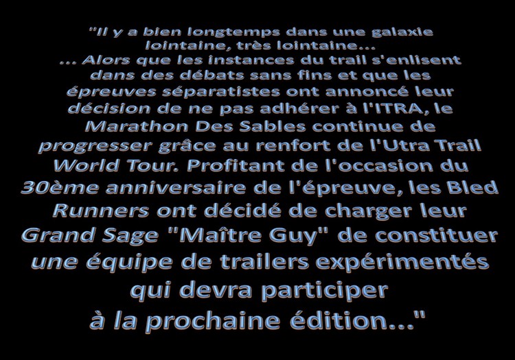 "-Maitre Guy, je ne comprend pas. Vous avez à votre disposition toute une troupe de trailers expérimentés qui connaissent déjà très bien cette course. Pourquoi faire appel au novice que je suis pour venir avec vous sur le territoire du Marathon des Sables ? - Allons jeune Padawan, plus grande que tu l'imagines est ton expérience. - Mais Maître Guy, ce n'est pas mon format de course, en tous cas pas pas le format sur lequel je sais être efficace. - Peu important est ce point. Avec les Bled Runners au Marathon des Sables tu te rendras et à la 30ème édition tu participeras..." La vache, il est trop fort ce Maître trailer... L'esprit Trail est en lui et lui permet de franchir tous les obstacles. En quelques minutes il est arrivé à me faire signer un bulletin d'engagement pour une épreuve à propos de laquelle j'ai toujours dit que je n'irai jamais. Enfin, jamais sauf s'il y avait une occasion particulière et si on partait en groupe. A croire que Maître Guy connaissait déjà toutes ces conditions avant de me convoquer au sein des Bled Runners. Mais pour le moment, seule la décision est prise, et il faut encore la transformer en réalité. Le mois d'avril voit passer la 29ème édition. Pour la première fois je vais suivre de près ce qu'il se passe. C'est vrai que le Marathon des Sables est une course particulière. Autonomie quasi complète, distance, terrain, chaleur, bivouac, énormément de conditions auxquelles il va falloir se préparer et avec lesquelles il faudra compter pour aller au bout. Côté inscription, on est en théorie bien loin du rush de certaines courses. Même si le Marathon des Sables n'est jamais complet je surveille quand même l'ouverture des inscriptions sachant que Maître Guy veille au grain. Souvent elles ouvrent juste après l'édition précédente, mais pour le moment rien ne semble bouger du côté du site internet. Vue la pression des Chevaliers Bled Runners, je suis obligé de faire de cette épreuve un objectif principal et comme il se situe à un horizon d'un an, j'ai besoin d'entrer tout de suite dans la course, de m'en imprégner, de la matérialiser. J'ai besoin de la préparer, d'en identifier et d'en maîtriser les contours, d'en connaitre le moindre recoin, d'avoir défini tout ce que je vais y faire et ce avant même d'avoir posé mon premier orteil sur le sable marocain. A chaque fois que je me lance sur un nouveau défi, j'apprécie de pouvoir trouver de vrais retours d'expériences, alors il me semble normal de faire la même chose. Le format de mon site habituel (plutôt statique) ne se prête pas au mode de partage que j'avais envie d'établir. Le format Blog est beaucoup plus adapté pour faire vivre toute cette année dans ses différentes dimensions, que ce soit la préparation générale, l'entrainement, la définition du matériel ou de l'alimentation, bref, tout ce qui pourrait aider n'importe quel apprenti Padawan si un jour, il se décide également à franchir le cap. (à voir sur http://objectif-mds-2015.over-blog.com/ ) En attendant de pouvoir demander le précieux sésame, me voilà à la recherche d'informations pratiques sur tout ce dont je vais avoir besoin pendant les 7 jours que dure la course. J'essaye d'accumuler de l'info soit au travers d'internet, soit auprès de Maître Guy et des chevaliers Bled Runners qui vont nous accompagner dans cette aventure. Presque tous ont déjà plusieurs étoiles à leur palmarès. Une étoile par mission réussie !