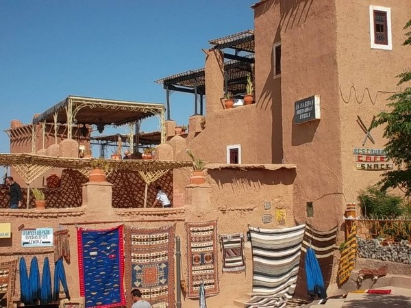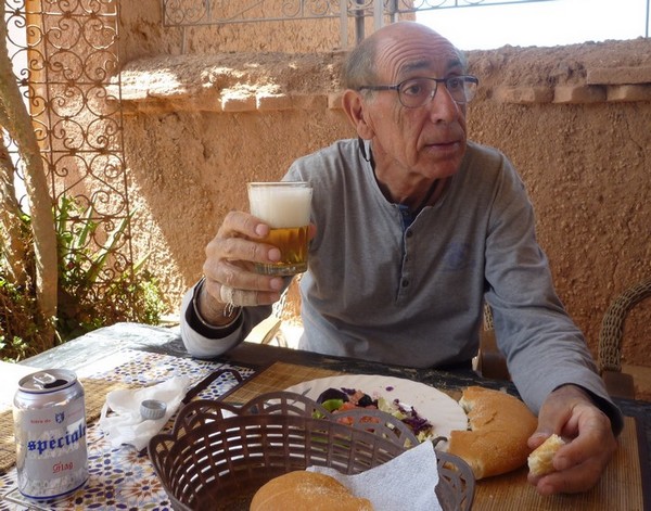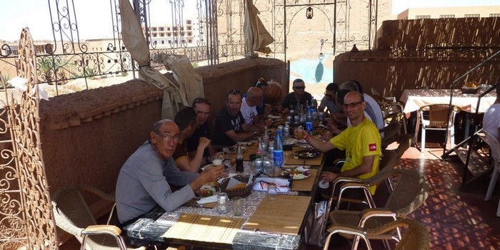 Ce matin on a prévu d'aller à la remise des tee-shirt finisher. Un grand moment avec en plus l'installation de la boutique MDS. Ensuite, pour fêter notre victoire, Maître Guy a organisé un repas sur une des terrasses les plus sympathiques de la casbah. Le reste de l'après midi étant destiné à faire quelques emplettes dans le souk de Ouarzazate. Donc après un solide petit déjeuner, on se lance en direction de l'hôtel où se déroule la remise des maillots finisher. Quand on arrive dans le hall de l'hôtel, il y a environ 1h30 d'attente pour pouvoir accéder à la salle où se fait la remise. Ok on n'a pas grand-chose d'autre à faire, mais c'est long, très très long. Mais si ça s'arrêtait là encore, j'aurais juste grogné un peu... sans plus ! Après nos 1h30, on a le droit d'entrer dans la salle de réception transformée en marché du temple. La salle est un vaste labyrinthe où on peut acheter tout et n'importe quoi à 3 conditions... Vouloir un produit marqué MDS, ou WAA et avoir un peu se sous... Rappelez vous le côté business de la course dont on a déjà parlé. Ici c'est clair et ceux qui pleurent que l'UTMB est devenue une course commerciale devraient venir faire un tour au MDS. Mais bon, après tout, personne n'est obligé d'acheter quoi que ce soit, donc à partir du moment où c'est open, on va considérer que ça fait partie des pratiques acceptables. Ce qui l'est beaucoup moins, c'est que dans les faits, il y a plusieurs dizaines de personnes pour s'occuper de la vente des souvenirs et de l'équipement, le tout étalé sur plusieurs dizaines de mètres de tables, et que pour la remise des tee shirt finisher, il n'y a qu'une seule file d'attente dans un coin de la salle. Alors faire du business pourquoi pas, mais faire poireauter les concurrents de la sorte uniquement pour privilégier la vente de produits, là on dépasse franchement les limites des bornes comme le disait le jeune Lucas à Maurice son poisson rouge (fouillez du côté de vos souvenirs sur les pubs Nestlé). C'est la foire d'empoigne. Aucune file identifiée, ça se bouscule, en plus c'est dans un coin perdu au fond de la salle donc pas mal de gens n'ont même pas vu que c'était la remise des maillots tellement il y avait de monde et ont dû refaire la queue une seconde fois. Quand ils se décident à essayer de faire des files d'attente, ils n'ont même pas de quoi fixer un simple bout de carton au plafond avec les n° de dossards concernés. Par contre pour la vente, là c'était méga organisé. [Mode des top des des flop ON] FLOP : L'organisation de la remise des tee-shirt. OK pour que ça serve à faire venir les coureurs dans la boutique MDS, mais un minimum d'organisation sur cette remise semble la moindre des corrections. [Mode des top des des flop OFF] Patrick, l'an prochain, tu ne veux pas demander à WAA de s'occuper de la remise des tee shirt ? Par contre, très important, ne les laissent pas fabriquer les maillots... Une catastrophe. J'ai hérité d'un M qui en fait correspond à une taille 14 ans !!! Tous les maillot, mais je dis bien tous, sont au moins 2 tailles en dessous de ce qu'ils devraient être (si on se base sur les tailles françaises). Alors soit ils se sont planté dans la fabrication, soit dans l'étiquetage, mais à ce prix là, on s'attendait au moins à avoir des maillots à la bonne taille surtout qu'on l'avait donnée lors de l'inscription. [Mode des top des des flop ON] FLOP : les maillots finisher 2 tailles trop petits et impossibles à porter ! [Mode des top des des flop OFF] Bref après avoir passé au final plus de 2 heures pour récupérer le tee-shirt, voilà que l'heure du déjeuner approche. On se rend donc sur la terrasse réservée au chevaliers Bleds Runners et à quelques-uns de leurs amis ;-), pour un repas des plus sympathiques. Grand moment de détente entre copains. Merci à Maître Guy de nous avoir mis ça au point !