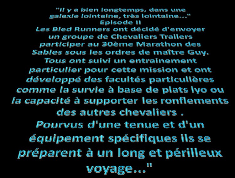 Il faut savoir que les Bled Runners ne laissent jamais rien au hasard. Maître Guy a tout organisé, jusqu'à la répartition des groupes d'intervention. Le groupe n°1 sera commandé par Maître Guy en personne. Il est composé uniquement d'experts à part moi. On y retrouve Gloria, Yves, Foued, William, Steph', LePhil, Maître Guy et bien sur votre serviteur. Le groupe numéro 2 est commandé par le redoutable Ela, une Chevalier (on ne dit pas chevalière) traileuse originaire d'une de ces planètes glaciaires située à l'est de la galaxie Europe, la Pologne, et pourvue de deux grands yeux verts de type "la mouche". Elle est accompagné de son aide de camp, Wieslaw originaire également de Pologne, et son groupe est complété par Bruno, Laurent, Bert' (que j'ai connu lors de notre formation à l'école Kikourou) Jean-Charles et Pascalou, qui ne se sépare jamais de son étrange compagnon bleu.