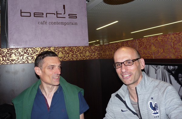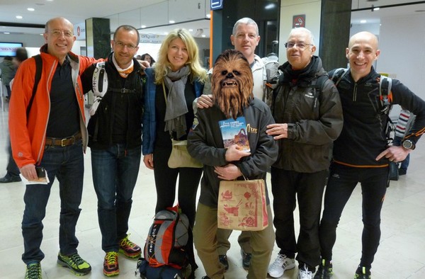 J'arrive au comptoir de la compagnie et de façon très discrète, je retrouve une partie des Chevaliers. de gauche à droite William, Laurent, Ela, Michel, Foued, LePhil et au premier plan notre Wookie de service Phil venu nous encourager mais qui ne nous accompagnera pas dans cette épopée.