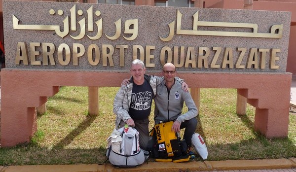 Embarquement à bord de la navette avec une chef de cabine probablement originaire d'Alderande vue la bonne dose d'humour qu'elle a su injecter dans ses communications auprès des passagers... et hop, c'est parti pour 2h30 de transfert. Ok. Avec le retard pris au départ, on est arrivé un peu plus tard à destination. Ouarzazate et son spatioport situé pratiquement aux portes de la cité. On en profite avec Bert' pour immortaliser ce moment.