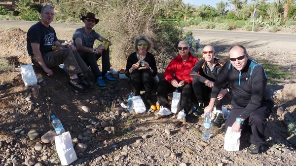 Remarque préalable : J'hésitais à faire un point à la fin du CR sur les tops et les flops de cette organisation. J'en ferai certainement une synthèse au final, mais je vais essayer de traiter les points positifs, comme les points négatifs au fur et à mesure de ce récit. Ok ça vous coupera un peu la lecture de l'histoire, mais les infos seront données au bon moment. Donc à chaque fois que vous verrez cette balise [Mode des top et des flops ON], vous saurez qu'il y a un point d'attention particulier. TOP : La qualité du road book. Complet, clair, en couleur. [Mode des top et des flops OFF] Il faut dire que notre camp de base n'est pas juste à côté. Il faut compter 6 bonnes heures de route pour rejoindre le premier bivouac et les routes locales ne permettent pas de rouler très vite... Le temps de passer en ville chercher un peu de réserve d'eau et de ravitaillement et nous voilà en route sauf que par malchance, seuls quelques pack d'eau ont été chargés dans le bus et qu'il n'y en a pas assez pour tout le monde ! Hors il faut savoir qu'à 15h00 au Maroc, il fait un peu chaud. [Mode des top et des flops ON] FLOP : L'absence d'eau dans le bus, alors qu'on a pas le droit d'en emporter avec nous dans l'avion ! Ce n'est quand même pas sorcier à la montée dans le bus de remettre une bouteille à chaque concurrent en même temps que le road book. [Mode des top et des flops OFF] Après environ 1h30, première halte pour effectuer un ravitaillement. On se pose en pleine pampa et chacun essaye de trouver un coin d'ombre. Un lunch bag nous est donné avec en plus un pain marocain, une orange et enfin, une bouteille d'eau. Certain discutent du contenu de cette collation... C'est une sorte de collection d'échantillons. Un peu de tout, mais perso j'ai bien aimé. En tous cas ça permet de caler un peu l'estomac, la qualité des repas sur le vol Transavia ayant un peu laissé à désiré (les plats principaux n'étaient même pas décongelés)