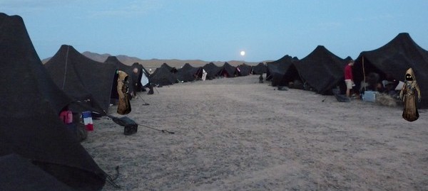 "- Vous êtes seul ou en groupe ? - ben je suis en groupe mais là je suis seul pour le moment - Ok alors file de gauche" Je prends la file de gauche et au bout un autre Jawa m'arrête "- Vous êtes seul ? - là oui mais je dois retrouver d'autres chevaliers qui étaient dans les navettes précédentes, et il y en a encore qui arrivent. - Mais pourquoi on vous a envoyé ici ? - J'en sais rien moi - Hé pourquoi vous me l'avez envoyé, il est en groupe - Oui mais là il est seul... - Dites vous savez, moi je veux juste aller à la tente 91, c'est là qu'ils nous ont dit qu'ils étaient installés - Pas possible la 91 elle est complète - Pourtant on a reçu un SMS... - Ah d'accord alors la 71 c'est par là !" Et il m'indique l'entrée du second cercle du bivouac. C'est aussi compliqué que ça de gérer des tentes ? La première est la N°111, je remonte donc les tentes, trainant ma valise dans le sable et les cailloux (les valises à roulette dans le désert, ça fonctionne moyen quand même) jusqu'à la tente 91. Heu, oui mais elle est remplie de gugusses qui dorment ! (il est tard). OK. Tant pis je continue le tour des tentes, de nuit, mais par chance quand on a vu qu'on arriverai de nuit, j'ai pensé à sortir ma frontale du sac à dos. A force de remonter le cercle, j'arrive à une tente où nous attends Maître Guy... c'est la 71, à un chiffre près c'était bon ! "- Maitre Guy, me voilà auprès de vous - Correctement le voyage a t-il passé ? Car ici, avec les tentes un gros merdier ça a été !" En fait Maître guy est arrivé avec le second avion et avec Pascalou (?) ils ont réussi à prendre 2 tentes côtes à côtes, sauf que ça n'a pas plu au Jawa responsable du bivouac qui en a viré une des deux, malgré l'insistance de Maître Guy qui lui expliquait qu'on était un groupe de 15. Rien à faire, incapable de gérer la situation, ils ont préféré nous interdire de vivre cette aventure en commun. [Mode des top et des flops ON] FLOP : Comment peut-on se permettre d'interdire à un groupe de rester ensemble alors que rien, j'ai bien dit rien, ne justifiait cette décision de séparer nos 2 tentes ? Franchement, avec des inscriptions finalisées plusieurs mois à l'avance, ce n'est pas compliqué de gérer de la pré-affectation de tentes, sur la base du déclaratif des coureurs exactement comme cela se fait pour les hôtels. Un tableau excel, du déclaratif coureur jusqu'à une date donnée, et comme ça c'est clair. On arrive on sait qu'on est dans la tente xx et basta. On ne parle ici que de gérer 8 nom par tente pour 180 tentes... Je peux même fournir le fichier excel si il faut ! Alors oui il y a les changement de dernière minute, mais qu'est-ce qui est préférable. Organiser 95% des cas et ne traiter le jour venu que les 5% de changements, ou bien ne rien gérer du tout et faire supporter aux concurrents les impacts de cette désorganisation ? Résultat, avec deux tentes assez éloignées nous ne vivrons que très partiellement cette aventure en commun. L'excuse apportée le lendemain qui était de dire "il y a trop de monde cette année" n'est ni recevable ni entendable. Pas entendable car si l'organisation a décidé d'ouvrir 200 place de plus, c'est à elle d'assumer et certainement pas aux concurrents d'en supporter les conséquences. Pas recevable car entre 1100 l'an dernier et 1300 cette année, cela n'impacte que peu la structure même de l'organisation. Cela aurait été recevable si la course était passée de 400 à 1300, mais ce n'est pas le cas. Cette augmentation du nombre de concurrents y est un peu pour quelque chose, mais ce n'est pas autour de l'édition 2015 qu'il faut chercher... On y reviendra plus tard. [Mode des top et des flops OFF] Bref, le coup de gueule se passe, le groupe de Maître Guy se retrouve enfin au complet, pendant que 15 tentes plus loin, celui d'Ela également. Vue l'heure je commence à avoir faim. Depuis ce matin on a eu un repas congelé dans l'avion et la lunch box vers 17h. Bravant la consigne de Maître Guy qui préfère être en mode autonomie dès son arrivée, je décide avec quelques preux chevaliers, d'aller voir si la cantine mise en place par les organisateurs fonctionne toujours à cette heure tardive. Là bonne surprise, alors qu'elle aurait déjà dû fermer, ils l'ont maintenue ouverte pour qu'on puisse reprendre des forces. [Mode des top et des flops ON] TOP : Le repas assez copieux et l'équipe en charge des repas qui nous a attendu. Ca a fait un peu retombé la déception de voir notre groupe séparé [Mode des top et des flops OFF] Un bon repas avec une bonne bière, sur des tables basses, assis sur des tapis, alors que la température est agréable. Ca fait du bien de se poser un peu. On traine un peu ici, puis il est temps de retourner dans nos tentes respectives histoire d'aller tester notre matériel de bivouac en conditions réelles... Pas trop le temps de faire 50 choses. Je sors mon tapis, mon duvet et le sac en soie, je me déshabille et hop, je vais rapidement rejoindre Morphée accompagné par un petit vent qui traverse la tente de part en part...