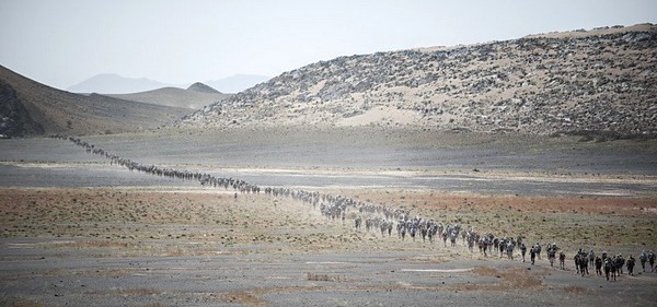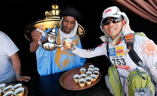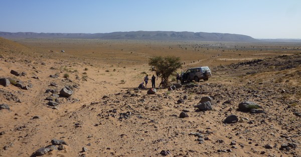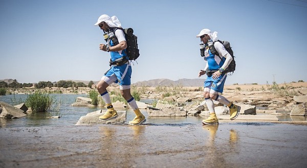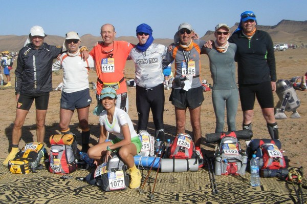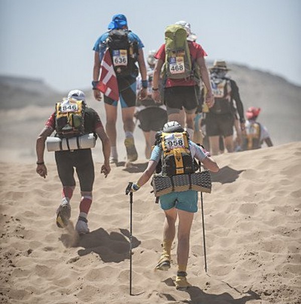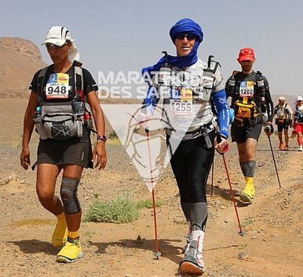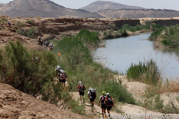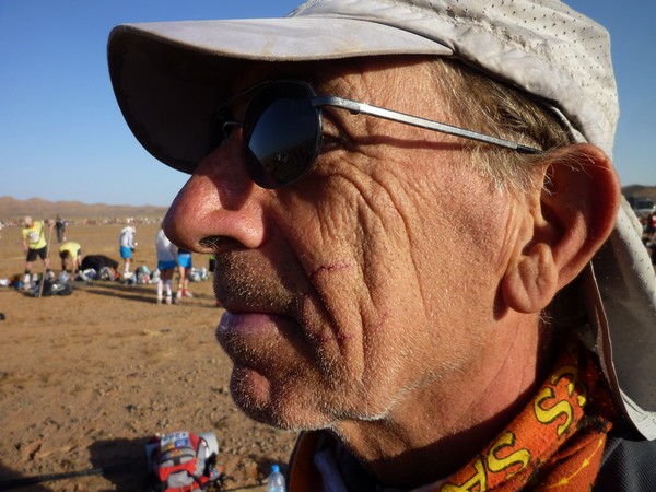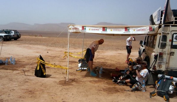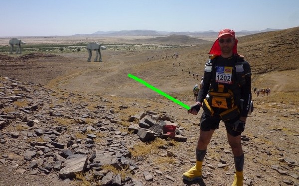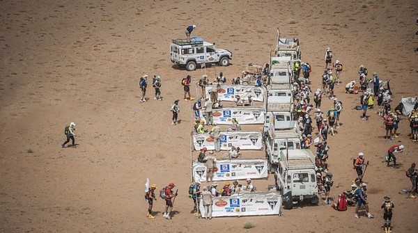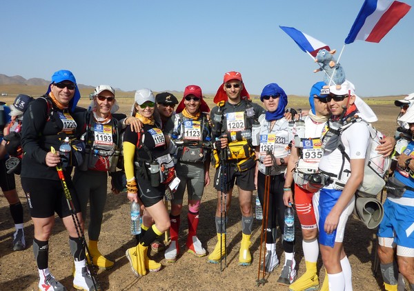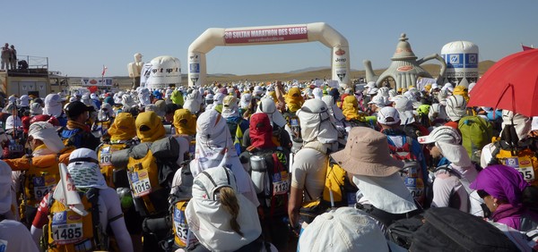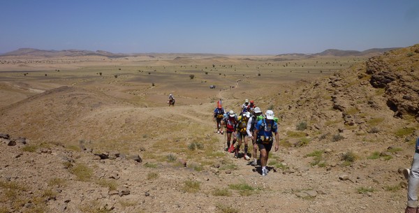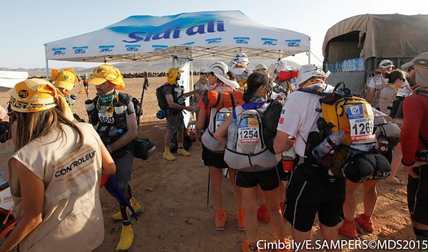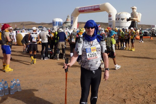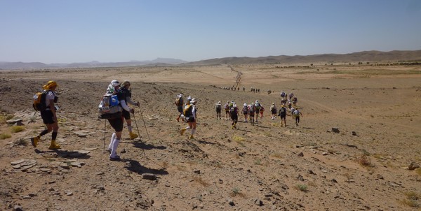 Je me souviens d'une histoire que nous racontait Phil, notre Wookie, quelques temps avant le départ. "A 6h00 précise, débarque Bachir avec ses hordes de Yallah Yallah, et en 2mn la tente a disparu et on se retrouve les fesses sur les cailloux". Pour éviter ça j'ai déjà rangé toutes mes affaires dans des sacs. Même en cas de tempête, je ne risque pas de me retrouver avec des affaires dans tous les coins du campement. Je vais alors entamer mon protocole du matin. Ce sera pratiquement le même chaque jour. Un vrai chevalier a besoin d'avoir des points de repère. Ce sont des choses que je fais toujours dans le même ordre et au même moment. Ce sera d'ailleurs pareil aux CP ou à l'arrivée des étapes, mais ça on en parlera plus tard. Dans l'ordre, ça donne réveil, petit déjeuner, toilette et soins, récupération de l'eau, mise en tenue, rangement du sac La nuit a été assez similaire à la précédente. Pas mal de vent le soir, mais assez peu de fraicheur, sauf vers 3h du matin où comme la veille il y a eu une petite descente de température, mais très facilement supportable. Je sens bien les effets de mon tapis un peu minimaliste, mais avec ses 150g, il est suffisant pour m'apporter le confort minimum attendu. Pour la première fois je suis passé par la case "stylnox" afin d'assurer une nuit réparatrice, ou plutôt dans notre cas, une nuit préparatrice. Il faut dire qu'on a dans la tente quelques gros moteurs diesel. Une fois réveillé, ma première tâche va donc consister à préparer mon petit déjeuner. Par contre ce matin c'est petit déjeuner de luxe. Normal, comme je n'ai pas à le porter j'ai pris des choses un peu plus lourdes que la normale. Ce matin c'est : - Petit déjeuner anglais en version autochauffant - Un grand café également en autochauffant - 2 gateaux de riz au caramel Yabon, mais pas déshydratés - 2 crackers - 2 cachet de supradyn Intensia Ca fait beaucoup mais je vais essayer de ne pas trop puiser dans mes réserves dès le premier jour. Le plat auto chauffant est vraiment super. Il s'agit d'un plat normal dans une poche en alu souple (comme celle des plats lyos) et qui est fournie avec un sac en plastique et des sachets de poudre réactives à l'eau. Il suffit de mettre les sachets de poudre dans le sac en plastique, de verser 10cl d'eau, et de glisser le sachet en alu dedans... Le résultat est assez bluffant. 5mn plus tard vous avez un plat complet (saucisses haricots, bacon,...) chaud et plutôt bon. en y ajoutant le café, les crackers et, cerise sur le gâteau, justement du gâteau de riz, je suis bien calé. Je prend le temps de bien manger tout ça tranquillement, surveillant l'arrivée tant attendue de Bachir... 6h00, il va bientôt arriver... 6h15, il est en retard... 6h30, il a du tomber en panne avec son hydroflotteur TX 2500,... Bref pas de Bachir, ni de Yallah Yallah en vue... Une fois le petit déjeuner pris, direction un rapide brin de toilette. Déjà qu'on va avoir du mal à se laver le soir après la course, alors le matin, on fait dans le light. Les dents grâce aux échantillons de dentifrice, un coup sur le visage, et surtout un contrôle des pieds. Aujourd'hui ça va se limiter à la pose des strap puisque je n'ai encore aucune blessure, et que je compte bien éviter d'en avoir. Je pose donc les morceaux d'elasto aux endroits prévus (voute plantaire, talon et talon intérieur, jointure sous les orteils) et je les recouvre avec de l'Hypafix (un sparadap très fin mais très résistant) de façon à éviter une partie des frottements. Toujours pas de Bachir ! Début de la distribution d'eau. deux bouteilles par coureur. En fait cela permet de faire le plein des 2 bidons du sac et d'avoir de quoi boire en plus en attendant le départ. On doit obligatoirement faire valider le carton de pointage pour l'eau sous peine de pénalité. En général, un ou deux chevaliers de la tente vont chercher l'eau avec les cartons de pointage de tout le monde. Et ça tourne tous les jours. Il est temps d'enfiler pour la première fois l'intégralité de la tenue. Il n'y a pas d'urgence, le départ n'est prévue qu'à 9h00, mais on a une première mission avant le départ aujourd'hui. Nous allons y revenir. J'enfile donc la tenue prévue et qui ne devrait pas changer pendant la semaine. Chaussures hoka, chaussettes DK, guetres raidlight, corsair long, maillot X'trem team, et bien sûr le cheche. Je fixe également le transpondeur à ma cheville pour valider les passages aux CP. Il me reste juste à m'attaquer au rangement du sac. Là encore tout est prévu (ou presque). Dans le sac de 20 L Raidlight, je dois pouvoir tout rentrer. Je pose mon sac à plat sur le tapis et je mets dans le fond (ce qui sera en fait appuyé sur mon dos) les sacs zip avec l'alimentation, à plat. Cela fait une première épaisseur sans risque de "bosse". Je positionne les sacs restants en seconde épaisseur, puis je cale dans les espaces restants tout le petit matériel dont la plus grosse partie tient dans la gamelle. Je glisse ensuite le sac avec la tenue de bivouac. A partir de là je dois normalement attacher à l'extérieur le matelas roulé avec le sac de couchage, sauf que mon sac n'est pas plein. Etrange quand même. Je regarde autour de moi si je n'ai rien oublié , mais visiblement non. Pas de doute il me reste de la place un peu partout dans le sac. Du coup il me vient une idée saugrenue en tête. Et si j'essayais d'entrer le sac de couchage dedans. Il a la particularité d'être ultra compactable, alors, même si je n'ai pas la place de le rentrer roulé dans sa housse, je peux essayer de le "bourrer" un peu dans tous les recoins. je commence à le glisser un peu partout et 2mn plus tard, me voilà en train de fermer le sac à dos avec l'intégralité du matériel dedans en dehors du tapis de sol. Franchement je ne pensais pas que tout pouvait tenir de cette façon là. C'est le moment que choisi Bachir pour arriver mais sans les Yallah Yallah habi