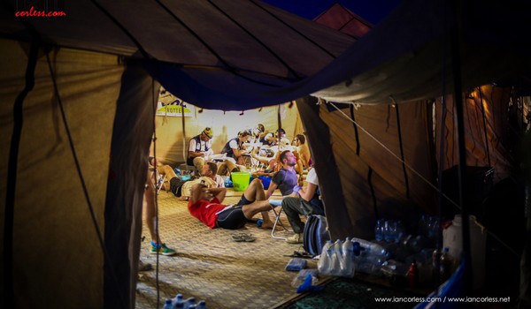 TOP : Le passage sous le brumiateur à l'arrivée. [Mode des top et des flops OFF] Pas simple à transporter ces 3 bouteilles d'ailleurs. Direction la tente 71. Pas de chance on est pratiquement à l'opposé de l'arrivée ce qui fait quelques centaines de mètre en plus à parcourir, et après 7h de course, ou plutôt de marche, 300m, c'est long ! Arrivé à la tente je retrouve LePhil, Gloria et Yves qui sont déjà là. Normal ils sont bien plus rapides. Je suis donc le 4ème chevalier à rentrer au bercail. Une fois encore, l'enchaînement des tâches à venir va se soumettre à un rituel précis. Vidage du sac à dos pour le mettre à sécher, préparation de la boisson de récupération, préparation de la collation d'arrivée, changement de tenue pour la tenue de bivouac, toilette Ensuite, suivant les jours et l'état de santé, ce sera les soins chez les toubibs ou sous la tente suivant ce qu'il y a à faire, passage à la tente email, puis retour à la tente pour préparer le diner et ensuite gros dodo pour préparer la journée du lendemain. Donc cette première journée ne déroge pas à la règle. Arrivé à la tente je détache mon matelas et je vide mon sac à dos que je met à sécher au soleil. Pendant ce temps je sors mon sac zip n°1 avec l'intégralité de mon ravitaillement jusqu'au départ de la course demain. Comme ça, là aussi aucune question à me poser ni de chose à chercher dans les multiples sacs. Je reconstitue ma boisson de récupération. 1 litre d'eau avec un sachet d'Idrolitina, et 2mn après j'ai un litre de St Yorres. Vous n'imaginez même pas le bonheur de boire une eau salée après 7 heures sous le soleil à boire de l'eau plus ou moins chaude et sucrée. Dans le même temps je reconstitue ma collation d'arrivée. En général c'est une compote, parce que c'est rapide à faire, pas besoin de chauffer d'eau et surtout j'aime ça. Pendant que ça se réhydrate, j'enlève intégralement la tenue de course et j'enfile un cuissard léger, un tee shirt et mes tongs. La tenue est mise à sécher également, et là je profite d'un temps calme pour manger et boire, tranquillement. Une fois le ravito terminé, direction la toilette. Pas ou peu d'eau disponible, alors on fait avec. Un gant pré-impregné suffit pour le gros du travail... Et une lingette compressée pour les finitions. Ca permet de conserver un minimum d'hygiène et surtout de se sentir propre, même si c'est assez relatif. On peut passer aux opérations optionnelles... Soins et/ou envoi d'email. Aujourd'hui en enlevant les chaussettes j'ai découvert deux petites ampoules au niveau des orteils. Pas de chance ce sont deux zones que je n'avais pas protégé. Techniquement parlant, j'aurais pu les traiter moi même, mais il y en a une que est placée derrière l'orteil et je me rends compte qu'au fil des années il y a des pliages de jambes que j'arrive de moins en moins à faire. Du coup je me décide à aller voir les docs histoire de faire les choses proprement. Pour le reste rien. Ni blessure, ni douleur. Le choix de la marche a été le bon. Comme c'est le premier jour, je décide de passer également par la case envoi d'email, sauf que je n'avais pas trop anticipé la durée d'attente. Le système est assez bien organisé, après avoir fait une petite file d'attente à l'extérieur, celle-ci se poursuit à l'intérieur de la tente, à l'ombre et avec de quoi s'assoir. Le luxe. Ensuite dès qu'un des 15 ordinateurs se libère, on prend son tour. Choix du clavier (bonne idée), une interface utilisateur super simple, et hop, en quelques minutes on peut rassurer la famille restée sur la terre en leur disant que tout va bien, à condition de connaître l'adresse mail du destinataire. [Mode des top et des flops ON] TOP : La possibilité d'envoyer un message. Un peu d'attente mais ça en vaut la peine. [Mode des top et des flops OFF] Ok ça m'a pris pas mal de temps quand même. Du coup j'enchaîne avec l'infirmerie. Là aussi il y a de l'attente mais on a de quoi s'occuper. Quand on arrive, un doc fait le dispatching entre les soins des pieds et les autres soins, puis nous donne un ticket avec un n° de passage. Ensuite en attendant son tour, on passe à la désinfection. Il y a un grand bac autour duquel on s'installe pour se nettoyer les pieds avec de la betadine. Comme il faut tout détremper, je commence par enlever l'intégralité de mes protections, puis je traite les pieds. Une fois désinfectés, j'enfile les surchaussures données à l'entrée et je vais attendre sous une des tentes de repos mises en place. Petit moment de calme en picolant un peu d'idrolitina. Ah oui, quand vous allez voir les docs, il faut toujours y aller avec une bouteille d'eau pour continuer de s'hydrater pendant l'attente.
