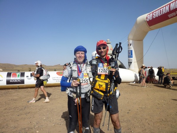 Arrivée km 42,2 - 16h02 GMT - 8h37 de course On se prend dans les bras avec Bert. Je crois qu'on est aussi heureux l'un que l'autre. On s'approche de la remise des médailles, et là surprise, pas de Patrick Bauer... Une gentille bénévole nous remet la médaille autour du cou nous dit un petit bravo et... plus rien. C'est tout, c'est fini... Heu elles sont où les trompettes, la joie hurlante, la fête; les cris... Grand blanc ! Il en faudra plus que ça pour entamer notre moral, mais c'est vrai que ça me fait un peu penser aux arrivées à la "Gestin" quand après un non stop tu te retrouve tout seul à l'arrivée... On est pas là pour les honneurs, mais quand même... On apprécie un peu d'affection dans ces moments là! [Mode des TOP et des FLOP ON] FLOP : L'absence de Patrick. Et personne pour le remplacer. Les mauvaises langues diront qu'il était plus important d'aller choyer les sponsors que d'accueillir les concurrents... Quoi qu'il en soit, c'est une page supplémentaire de l'histoire du MDS qui se tourne. [Mode des TOP et des FLOP OFF]