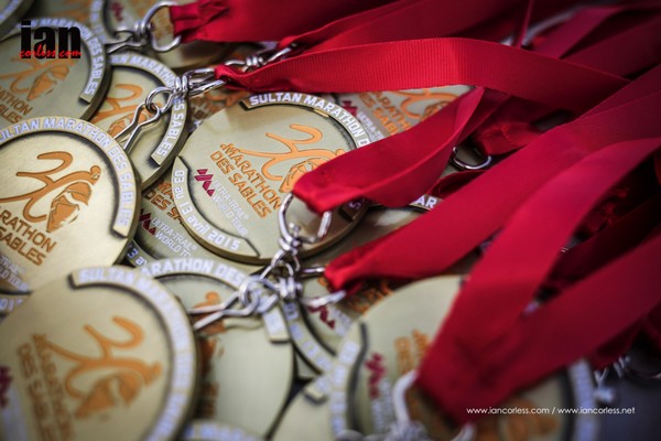 A la tente je garde mes bonnes habitudes. Vidage du sac, séchage, collation d'arrivée avec eau gazeuse, crème caramel et crakers, puis toilette. Passage par la case email, et à mon retour toute la tente est rentrée. Les 5 chevaliers Bled Runners de la 71 sont là. On n'en a pas perdu d'autres aujourd'hui. Dans la tente de Ela et Bert', ils sont au complet. Les 8 seront finisher. Et même si pascalou a les pieds dans un drôle d'état, Il aura emporté Ratatouille sur la ligne d'arrivée. Une fois encore, on est partagé entre le plaisir d'avoir réussi et le fait que ce soit pratiquement terminé. L'étape de demain sera chronométrée mais non comptée dans le classement officiel. Encore une bizarrerie de l'organisation (il faudra expliquer l'intérêt de la chose qui va provoquer un double classement !) [Mode des TOP et des FLOP ON] FLOP : Mais bons sang qu'est-ce qu'on a à faire de ce double classement. Soit la dernière étape n'est pas comptabilisée et on l'annonce clairement soit elle fait partie de la course à part entière. Est-il impossible d'envisager avoir une étape "solidarité" chronométrée officiellement ? [Mode des TOP et des FLOP OFF] Pour le moment l'heure est à refaire la course, et à se protéger du vent toujours présent même s'il est moins violent que la veille. Par contre j'ai l'impression qu'il fait plus froid. Ou alors c'est la fatigue et le relâchement d'après course. Beaucoup de monde a proximité du bivouac puisque les invités sont arrivés. Il s'agit des familles ou des sponsors qui viennent accompagner certains coureurs pour l'étape solidarité de demain. Même s'ils n'ont théoriquement pas accès au bivouac (on est en autonomie jusqu'au demain matin), il y en a qui circulent quand même; et là on a la drôle de surprise de voir arriver notre ami William. Il s'est fait transporter jusqu'ici depuis Ouarzazate juste pour venir nous voir et retrouver sa fille demain. Ca fait plaisir de le revoir et d'avoir quelques nouvelles du reste de l'équipe. Il nous raconte un peu les conditions dans lesquelles ils ont vécu leur retour sur Ouarzazate après leur abandon... Juste édifiant ! [Mode des TOP et des FLOP ON] GROS FLOP : Si je ne devais en garder un ce serait celui là. C'est de loin le point le plus indigne de la part de l'organisation. Pourquoi ce besoin d'humilier les personnes qui pour certaines vivent déjà mal leur abandon ? [Mode des TOP et des FLOP OFF] On en reparlera dans le bilan d'après course. Pour le moment revenons à notre dernière nuit dans le désert. J'attaque mon dernier diner Lyo. Noix de cajou, Pates bolognese, parmesan, compote poire-pomme et un petit café. La soirée prévue est un peu particulière ce soir. Des musiciens de l’Opéra de Paris et une cantatrice doivent venir se produire sur scène en plein désert. Tradition étonnante et surprenante avec le décalage d'image entre l'Opéra et la pauvre horde de trailers aux maillots rendus rigides par le sable et la sueur. Doit suivre ensuite la remise des prix ! Remise des prix ??? Mais il y a encore une étape demain ! Ah oui mais comme elle ne compte pas, et bien la remise se fera ce soir. Finalement, les conditions seront loin d'être idéale, et entre le vent, la fatigue, le froid qui tombe, et les 238km dans les pattes, beaucoup de participant, vont faire l'impasse et écouter le concert depuis leur tente. Le summum restera la remise des prix. Au delà du fait de récompenser l'exploit (bien réel) réalisé par les vainqueurs de chaque catégorie, la logistique d'organisation sera un peu bancale. Un invité devant remettre un prix qui n'est pas là (bon et bien on va demander à quelqu'un d'autre de venir remettre le prix en question), un autre qui n'est même pas au courant et qui arrive après la fin des opérations, ... Je ne sais pas s'il s'agit d'une lacune côté organisation ou si ce sont les intervenants qui n'étaient pas plus motivés que ça, mais c'est quand même très irrespectueux pour les coureurs qui doivent recevoir ces prix ! [Mode des TOP et des FLOP ON] FLOP : un FLOP mais pas uniquement à destination de l'organisation. Il concerne les partenaires, les annonceurs, les VIP qui devaient venir montrer un minimum de respect aux coureurs récompensés. [Mode des TOP et des FLOP OFF] Après tant de bon moment vécus en course pendant cette semaine, que de loupés... et quelle triste image de fin, alors que c'est justement là que tout doit rouler pour effacer les petits loupés des premiers jours ! Tout cela fait que je vais m'effondrer bien avant la fin de la cérémonie. Nombreux sont celles et ceux qui conserveront leur médaille autour du cou cette nuit C'est qu'il y a encore une étape demain. Même si elle ne compte pas pour le classement elle est un vecteur de communication important pour l'organisation et pour les actions de solidarité mises en place. Alors pas question de flancher !