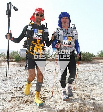 Terrain rocailleux, lit d'oued, petites buttes de terre faisant comme des sortes de vagues solides où j'ai failli exploser un de mes bâtons. Heureusement qu'ils sont souples les Xenon... parce que sinon, je finissais sur une seule patte CP3 - 33,7 km - 14h17 GMT - 6h52 de course Bipppppp fait le tapis lorsqu'on passe dessus. A ce moment-là on percute sur le fait qu'il s'agit du tout dernier CP. Dans mois de 9 km ce sera terminé. Fin de la course et pratiquement de l'aventure. Ca fait tout drôle d'avoir passé autant de temps à préparer cette épreuve et de se retrouver maintenant aux portes de l'arrivée ! Dernier protocole express. Il ne me reste qu'un peu de viande séchée, et c'est très bien comme ça. Un peu d'eau claire (je n'ai plus de poudre à y mettre) et ça va le faire, forcément !