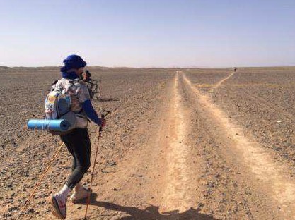 Comme notre départ est prévu à 7h00 (mais qu'il ne sera pas respecté comme chaque matin), cela nous oblige à ne pas trop trainer. Une fois le protocole habituel déroulé, je vais vers l'arche de départ... Pour le moment tout va bien, même si je me sens bizarre. Pas de blessure, pas d'ennui, les pieds pratiquement nickel, juste l'impression de ne pas être dedans ! A force de répéter qu'une fois la longue passée c'est gagné, j'ai l'impression de me relâcher. Bon quoi qu'il en soit, et même si je n'ai aucun doute sur ma capacité à finir l'étape, il n'en reste pas moins qu'il y a encore quelques heures de course quand même. ...AC/DC, Highway to Hell, airspeeder à hélices..Vous connaissez la musique...