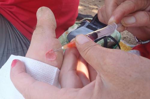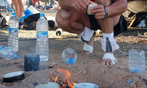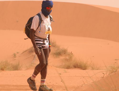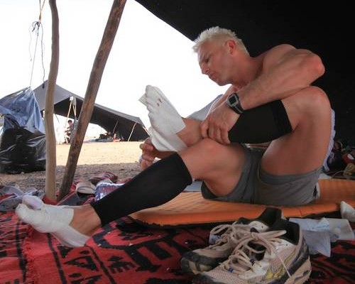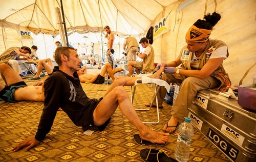 L’entretien pendant la course Normalement, si vous êtes habitué à ce type d’épreuves et que vous ayez fait une préparation sérieuse des pieds, il n’y a pas de soucis. On abandonne rarement le Marathon des Sables pour une ampoule, les coureurs le savent… Sur le Marathon des Sables, il y a une équipe médicale qui peut apporter des soins aux coureurs en cas de besoin. Normalement leur rôle est limité aux cas lourds, mais dans la pratique il y a une marge de tolérance dans l'interprétation de ce niveau de gravité Cependant, mieux vaut prévenir que guérir… - Dans votre sac à dos, emportez une ou deux paires de chaussettes (par temps sec, une est suffisante)fines, légères et aérées pour permettre aux pieds de respirer. - Changez de chaussettes tous les jours de façon à les laisser s'aérer - Nettoyez-vous bien les pieds à chaque arrivée au bivouac. Ca vaut le coup de consommer un peu de son eau pour ça, ou à l’aide de produits qui ne nécessitent pas de rinçage. - Par contre, et il s'agit là d'un avis personnel, je ne suis absolument pas favorable au fait de s'enduire les pieds de crème tous les matin (voir plusieurs fois par jour). Même avec des guêtres, il y aura toujours un peu de sable dans les chaussures, et si vos pieds sont "gras", le sable va s'y coller. - Le soir, après avoir bien nettoyé vos pieds, laissez les à l’air libre (ou mettez des chaussettes légères si vous avez des blessures) mais avec des sandales. Il faut laisser les pieds respirer au maximum…