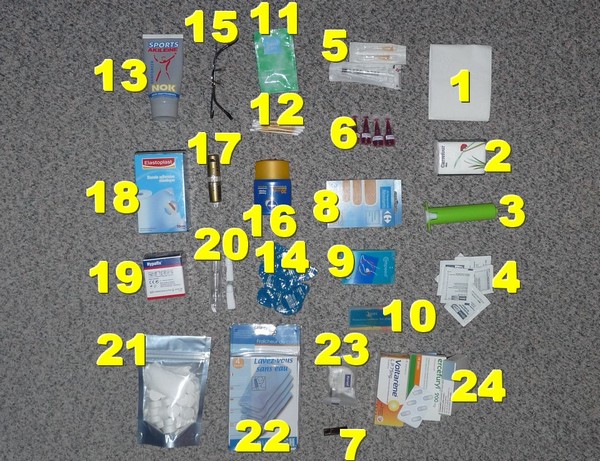 2 - Mouchoirs (15g) 3 - Pompe aspi venin (obligatoire) (27g) 4 - Lingettes antiseptique (obligatoire) (15g) 5 - 1 seringue + 2 aiguilles (5g) 6 - 4 Dosettes individuelles d'éosine (10g) 7 - 1 lame de scalpel (2g) 8 - Pansements (10g) 9 - Compeed (10g) 10 - Boules quies (4g) 11 - Shampoing 1 sachet dose (5g) 12 - Coton tige 10 (5g) 13 - Antifrottement Nok (50g) 14 - 12 lentilles (15g) 15 - Lunettes de vue pour le soir + cordon (40g) 16 - Creme solaire (obligatoire) (57g) 17 - Stick pour les levres (15g) 18 - Elasto (50g) 19 - Hypafix (20g) 20 - Brosse à dents (5g) 20 - Dentifrice (7g) 21 - Lingettes compressées (15g) 22 - Gants pré-hydratés (100g) 23 - Mini savon (10g) 24 - Pharmacie (Anti-diahrées, Anti-douleurs, Anti-inflammatoire, désinfectant intestinal) Retour d'expérience sur l'édition 2015