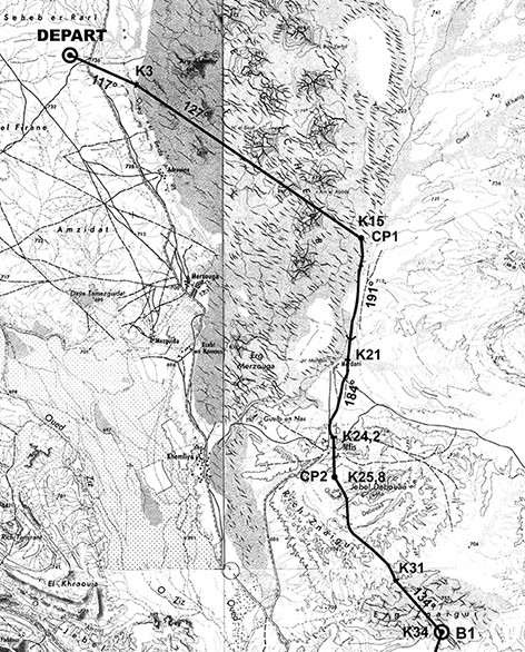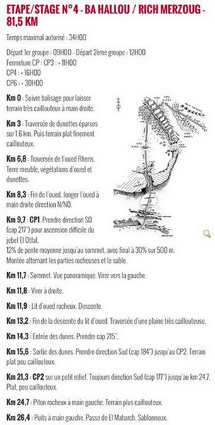 Le désert est un univers un peu particulier qui rend souvent compliqué le balisage d'un tracé. Les pistes utilisées par les véhicules ont tendance à se déplacer au gré du vent et du sable, alors que peut-il advenir de la trace de quelques coureurs ? Au cours de ces dernières années, j'ai rencontré plusieurs types de balisage sur ce type d'épreuve. Sur la Mauritanienne Race, on avait un balisage physique, c'est à dire que de la rubalise était placée à chaque fois que cela était possible (arbustes, herbe à chameaux,...) et le reste du temps, il y avait des dizaines de cailloux, peints en blanc, un peu comme si on suivait la piste du petit poucet. Pour les sections de nuit, des bâtons lumineux étaient placés tous les 200-300 mètres. C'est un balisage de qualité, mais qui présente des difficultés. Par exemple, si vous vous éloignez de quelques mètres de la piste vous pouvez très vite être perdu sans savoir dans quelle direction aller pour retrouver la trace. De plus, pendant la course, on a essuyé une tempête de sable rendant la visibilité nulle, et surtout le sable avec des vents assez forts avait complètement bouffé la rubalise. Petite astuce pratique. Lorsque vous vous arrêtez pour faire une pause ou satisfaire à un besoin naturel, pensez toujours à poser quelque chose (votre sac, ou vos bâtons) dans la direction vers laquelle vous voulez aller. On a déjà vu des coureurs faire une pose "pipi" et repartir en suivant le balisage... dans le mauvais sens ! Sur la Trans333, il n'y a pas, ou en tous cas très peu, de balisage physique. La progression se fait uniquement au GPS. Ca peut sembler compliqué au premier coup d'oeil mais en fait je me suis rendu compte que la grande souplesse et de la sécurité que cela apportait. Plus question de se perdre. Même si on s'éloigne de la piste, la GPS continue d'indiquer la direction vers le point suivant. On peut s'éloigner d'un oued ensablé pour aller chercher un terrain plus dur 100m sur le côté sans risquer de se perdre. Même chose en cas de météo défavorable. Le GPS n'est en général pas impacté par les conditions externes. Et pour les pauses techniques, plus de risque de repartir en arrière. La contrainte, c'est de disposer d'un GPS. Un coût non négligeable que certains organisateurs hésitent à imposer aux participants, d'autant que sur les courses longues, il faut partir avec des modèles à piles, les GPS à accus n'ayant pas l'autonomie nécessaire et les chargeurs solaires présentant un ratio poids/efficacité assez moyen. Tout ça pour dire que l'option retenue sur le MDS est le balisage physique, associé à la fourniture d'un Road book détaillé. Le balisage de jour Le parcours est indiqué par des balises tous les 500 mètres environ. Ca peut faire long, mais disons que ce sont surtout des points de repères ou de confirmation qu'on est pas sortie de la piste. Les indications du Road book permettent de conserver un axe de progression correct, sachant qu'on est pas dans une course d'orientation, et que le but n'est pas de piéger les participants. Un autre point est aussi à considérer, c'est le nombre de participants. Avec 1300 concurrents, à moins d'être dans les premiers (ce qui a peu de chance d'être mon cas), on va surtout être amené à suivre une file de coureurs, et dans le cas où on ne verrait personne devant, les quelques centaines de coureurs qui nous auront précédé auront laisser des marques bien visibles ! Reste le cas de la mauvaise météo. Là, la consigne de l'organisation est claire "En cas de vent de sable ne permettant aucune visibilité, chaque concurrent devra stopper sur l'axe du parcours et devra attendre les instructions des commissaires de course". C'est la meilleure solution de toutes façons. Vous sortez la couverture de survie, vous vous abritez et vous attendez que ça passe. On est dans un cadre avec une grosse assistance, dont il y a peu de chances qu'on nous abandonne pendant 2 jours ! Le balisage de nuit Sur l'étape longue où on est certain de courir de nuit, même principe que pour le balisage de jour mais avec des un balisage lumineux disponible depuis le CP3 ou CP4 suivant les horaires, et jusqu'à l'arrivée. Autre point très utile, chaque concurrent porte un baton lumineux accroché sur son sac à dos, ce qui, si jamais on se trouve dans une zone de dune et qu'on ne voit pas le balisage fixe suivant, permet de suivre d'autres concurrents à la trace. L'expérience 2015 m'a démontré l'efficacité de ce dispositif sur lequel j'étais au départ assez sceptique. Le road book Autant sur des courses comme l'UTMB, l'omniprésence du balisage rend difficile le fait de perdre le chemin ce qui fait que le road book sert surtout à préparer sa course. Sur toutes les éditions auxquelles j'ai participé, je n'ai jamais eu besoins de le sortir, autant sur le MDS il y a un véritable intérêt à l'emporter, et pas uniquement parce qu'il fait partie du matériel obligatoire. Chaque matin, lors du briefing, la direction de course donne des indications complémentaires ou des précisions sur certains passages. Le road book se compose de 3 éléments principaux qui se complètent. - Une carte sur laquelle figure le tracé de l'étape avec les CP, les azimuts de progression,... - Des schémas simples et assez clairs permettant de matérialiser les points clés de la progression - Une description texte des éléments particuliers qui seront rencontrés et des axes de progression à suivre La carte globale est un élément qui permet de se faire une idée du parcours de la journée.