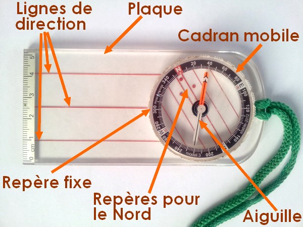Pour rester sur un usage simple je vous propose de présenter trois opérations de base. - Comment suivre un cap donné - Comment progresser une fois qu'on a défini un cap. - Comment vérifier si le cap que vous suivez est le bon Présentation de la boussole Il existe de nombreux modèles de boussoles. Du jouet au modèle de précision avec optique de visée, mais pour le Marathon des sables, si vous voulez avoir une vraie boussole avec un poids raisonnable, vous aurez tout intérêt à vous diriger vers une boussole "plaque" dont vous trouverez des modèles assez bon marché dans les grandes enseignes de matériel de sport Globalement une bossole se compose de 3 éléments principaux - la plaque - le cadran mobile - l'aiguille